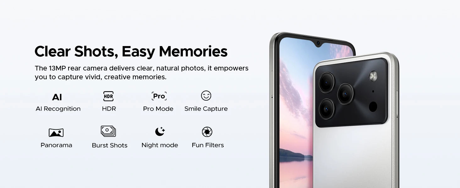 - Frontkamera (8 MP) und Hauptkamera (13 MP) ermöglichen klare Selfies und gelungene Schnappschüsse – perfekt für Social Media und Alltagsmomente.