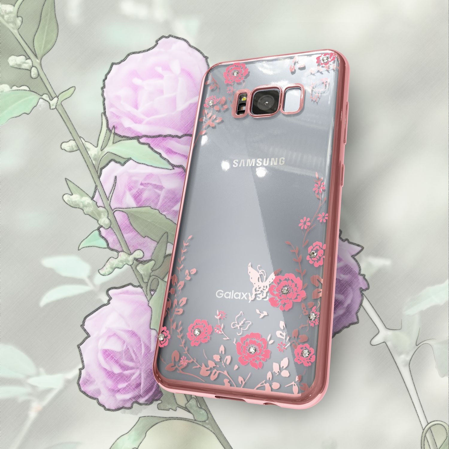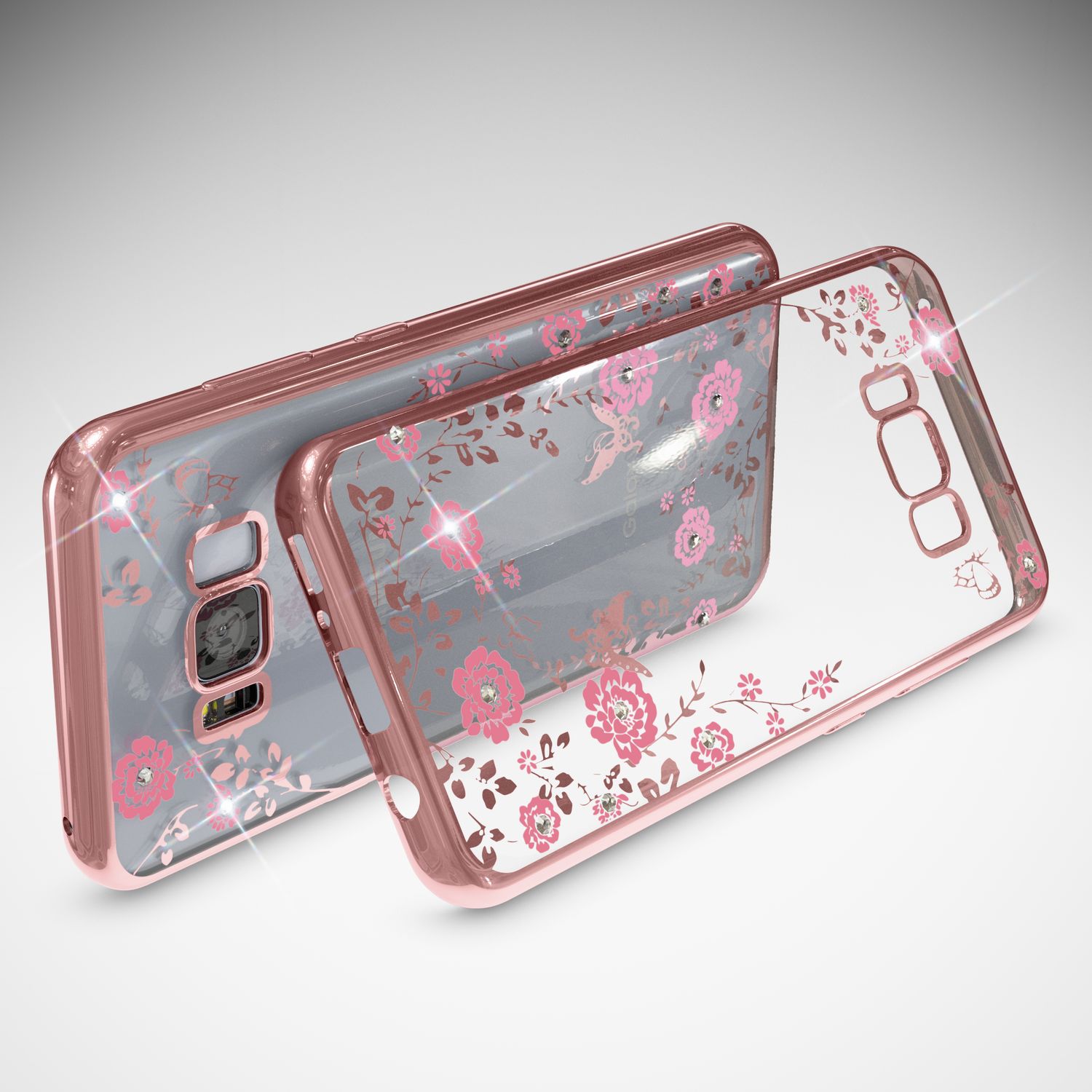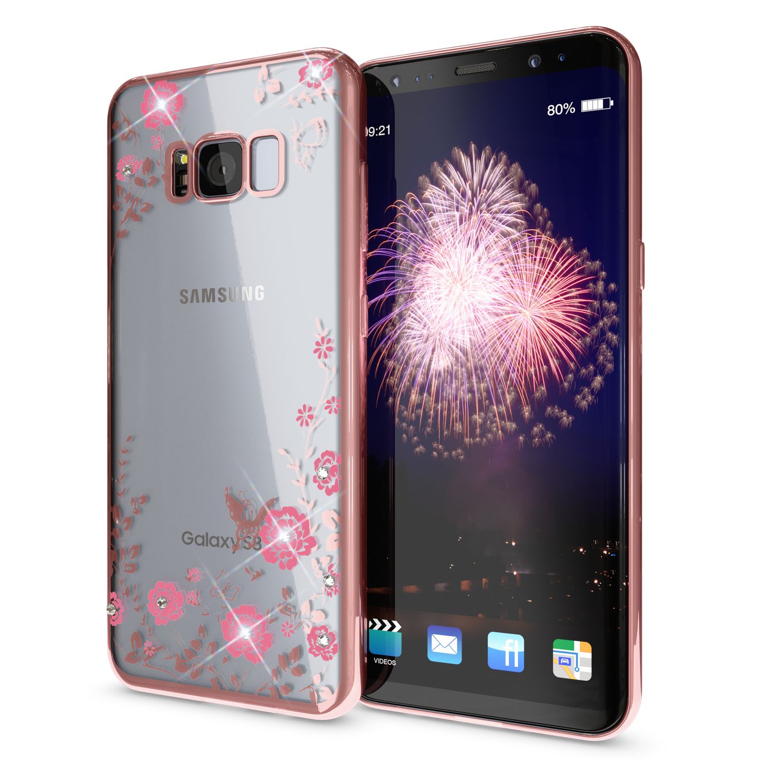 Samsung Galaxy S8 Plus Hülle Handyhülle von NALIA, Durchsichtiges Slim Silikon Case mit Blumen-Muster, Metall-Optik Dünne Schutzhülle Glitzer-Steine Bling Cover Etui, Handy-Tasche für S8+