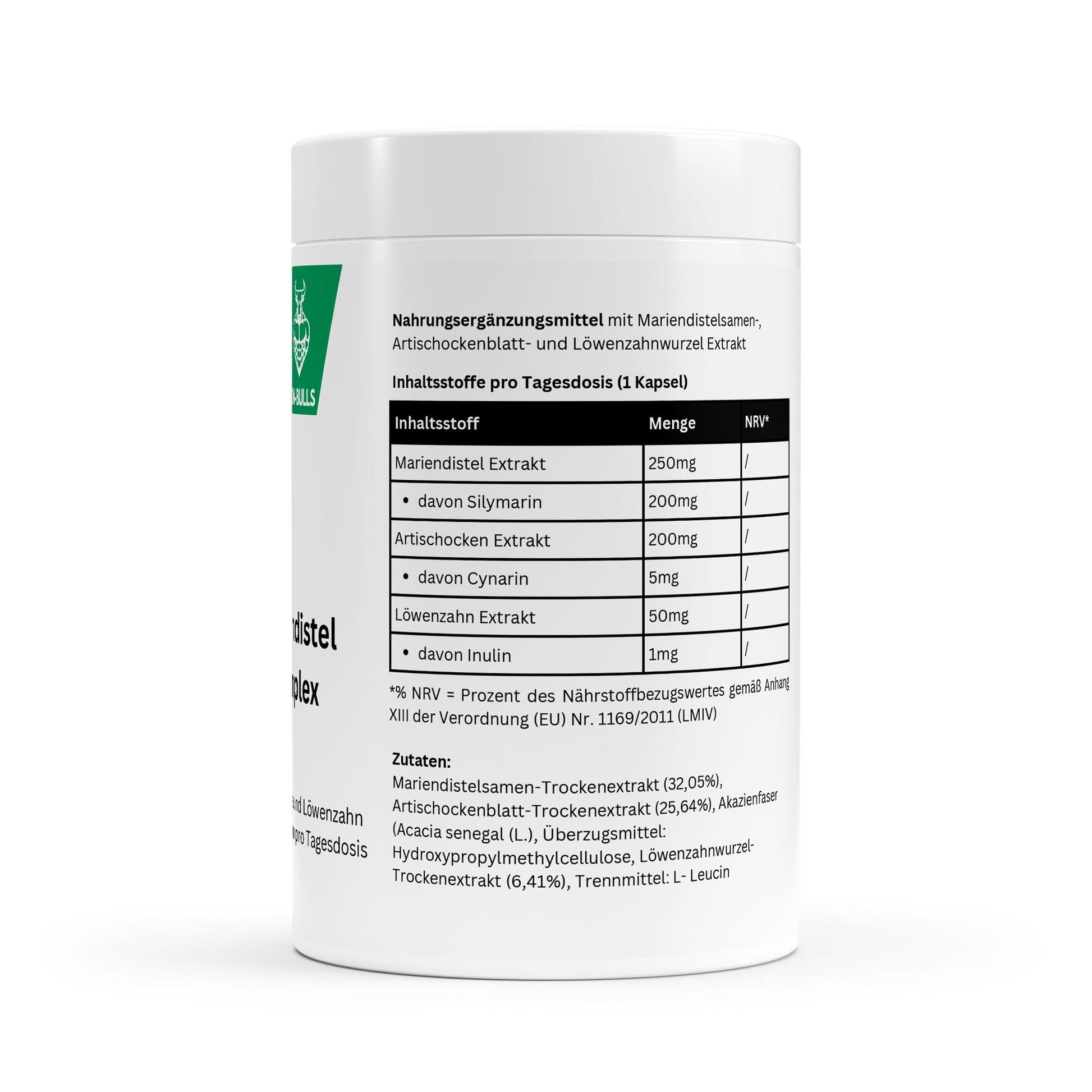 Mariendistelsamen-Trockenextrakt (32,05%), Artischockenblatt-Trockenextrakt (25,64%), Akazienfaser (Acacia senegal (L.), Überzugsmittel: Hydroxypropylmethylcellulose, Löwenzahnwurzel-Trockenextrakt (6,41%), Trennmittel: L- Leucin
