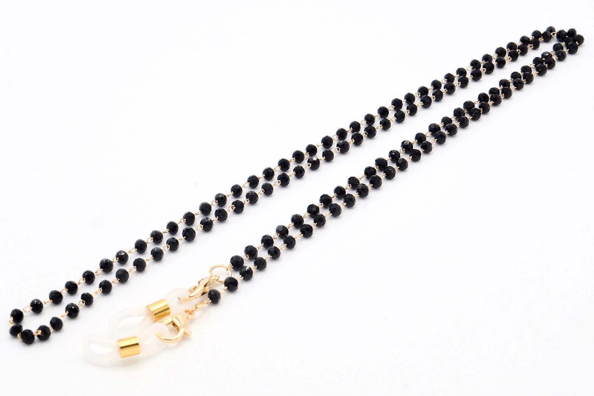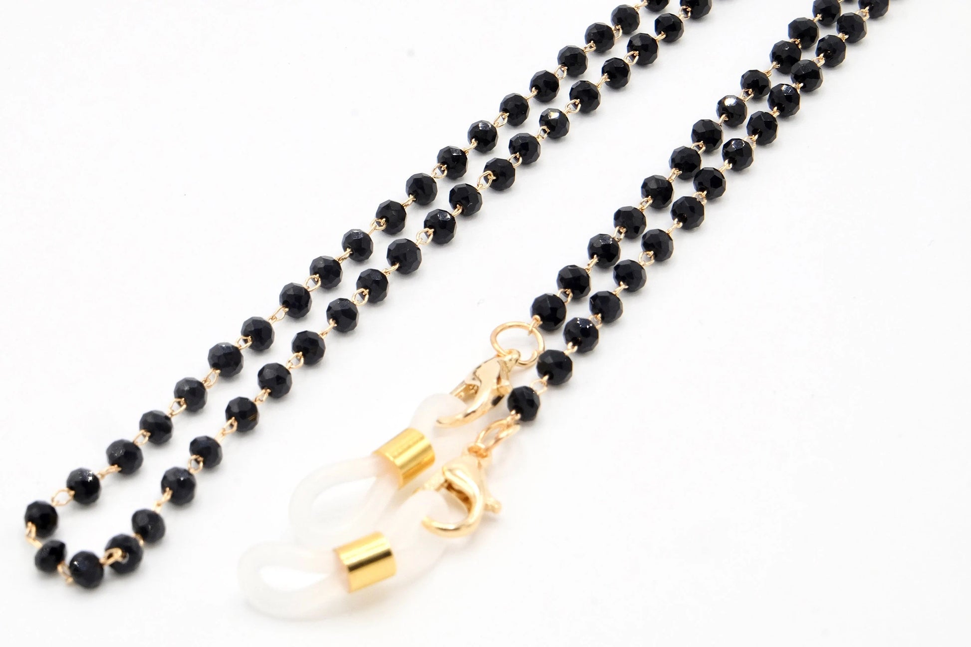 Die elegante Brillenkette ist aus zierlichen schwarzen Perlen gefertigt, die durch feine goldene Kettenglieder verbunden sind. Ein raffinierter Hingucker.
