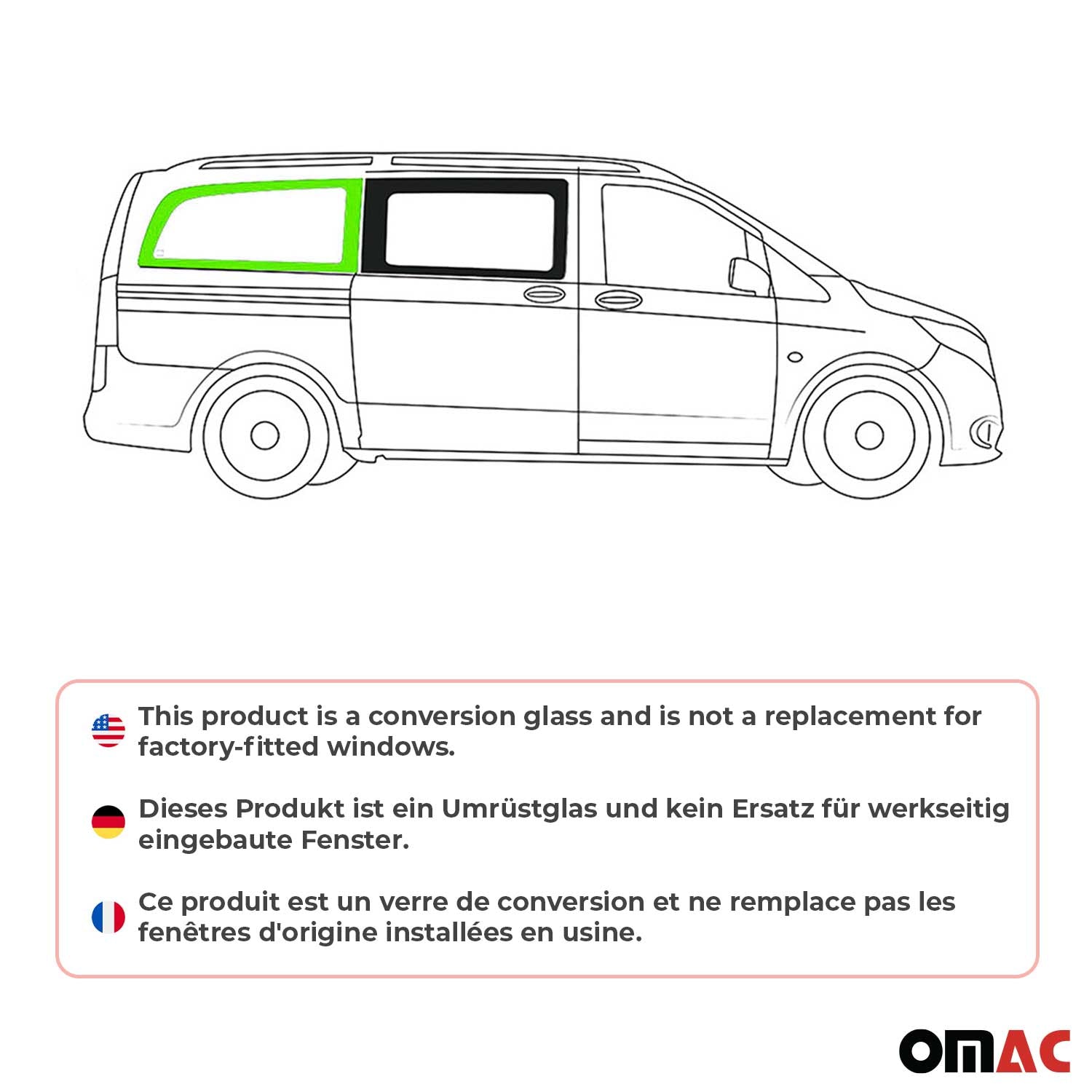 Dieses Produkt ist ein Umrüstglas und kein Ersatz für werkseitig eingebaute Fenster.
