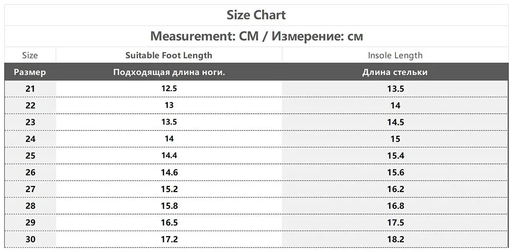 size_info: {"sizeInfoList":[{"length":{"cm":"12.5","inch":"4.92"},"size":"21","vid":-44},{"length":{"cm":"13","inch":"5.12"},"size":"22","vid":-45},{"length":{"cm":"13.5","inch":"5.31"},"size":"23","vid":-46},{"length":{"cm":"14","inch":"5.51"},"size":"24","vid":-47},{"length":{"cm":"14.4","inch":"5.67"},"size":"25","vid":-48},{"length":{"cm":"14.6","inch":"5.75"},"size":"26","vid":-49},{"length":{"cm":"15.2","inch":"5.98"},"size":"27","vid":-50},{"length":{"cm":"15.8","inch":"6.22"},"size":"28","vid":-51},{"length":{"cm":"16.5","inch":"6.50"},"size":"29","vid":-52},{"length":{"cm":"17.2","inch":"6.77"},"size":"30","vid":-53}]}