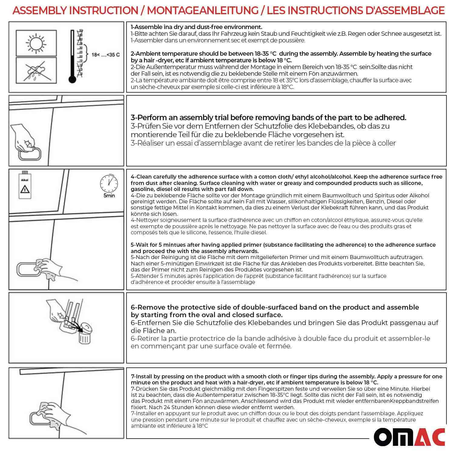 Speziell für Ihr Auto entwickelt, gute Passform garantiert. Die Installation erfolgt in Sekundenschnelle mit doppelseitigem Klebeband, das auf der Rückseite unserer Produkte vorinstalliert ist. Kein Bohren, kein Schneiden. (Bitte beachten Sie die Montageanleitung.)