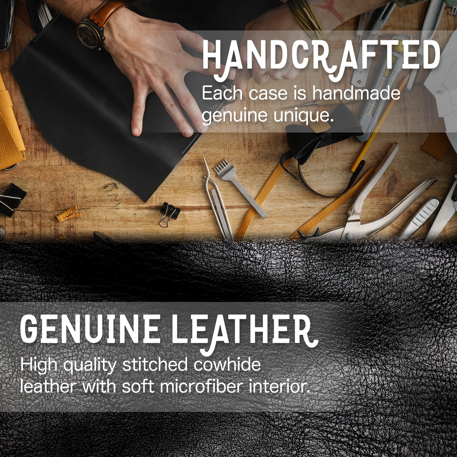 Die Hülle wird aus 100% echtem Rindsleder handgefertigt und überzeugt durch eine robuste Verarbeitung und eine geschmeidige Haptik. Die Klapphülle schützt Vorder- und Rückseite deines Handys zuverlässig vor Stößen, Kratzern und anderen äußeren Einflüssen.