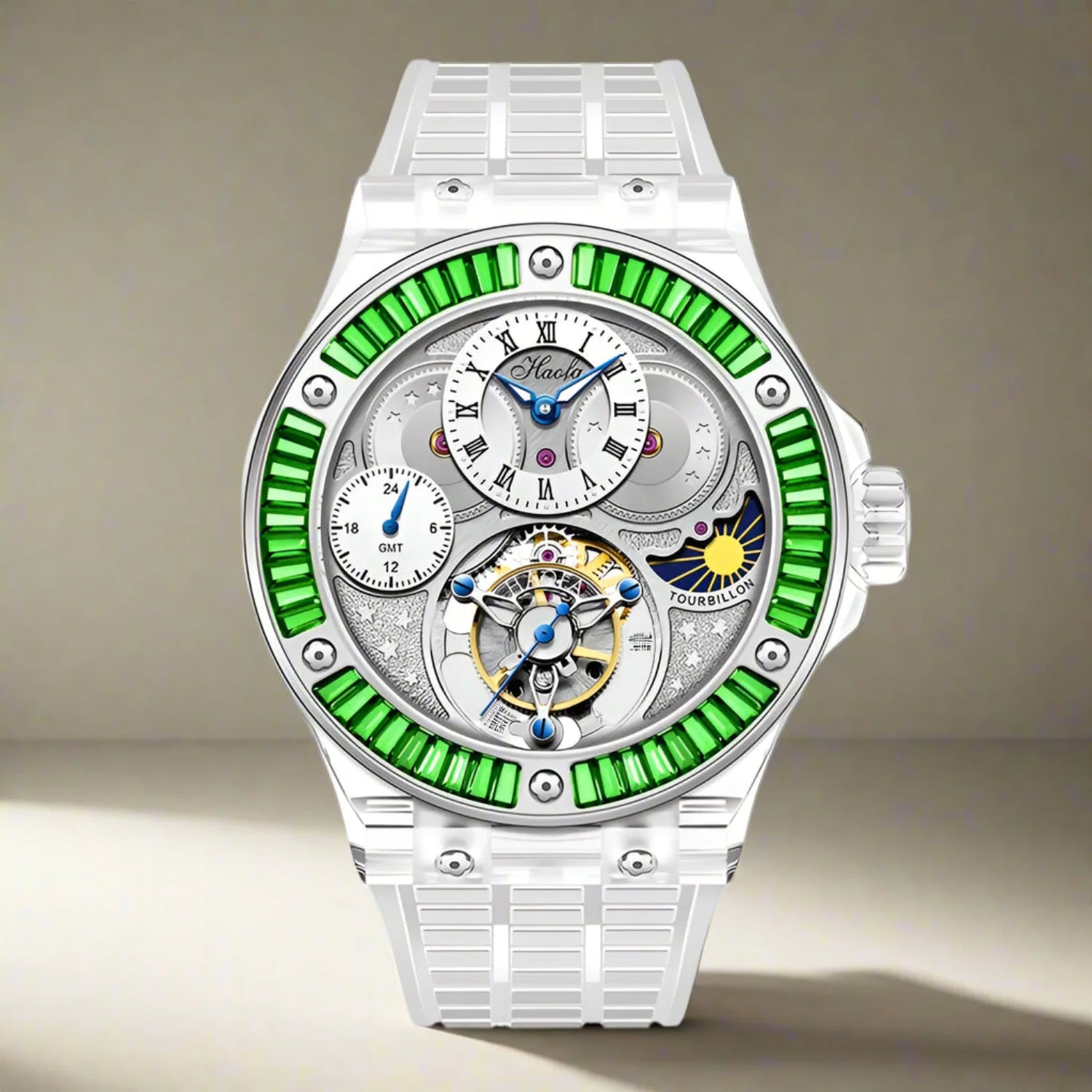 Step into a new era of horology with the Haofa 2101 Tourbillon, a limited-edition masterpiece featuring a fully transparent K9 crystal case, a rainbow bezel, and a bold skeleton design. This timepiece blends luxury, futuristic style, and mechanical precision to create a truly eye-catching wrist watch that’s as much an art piece as it is an instrument of time.
