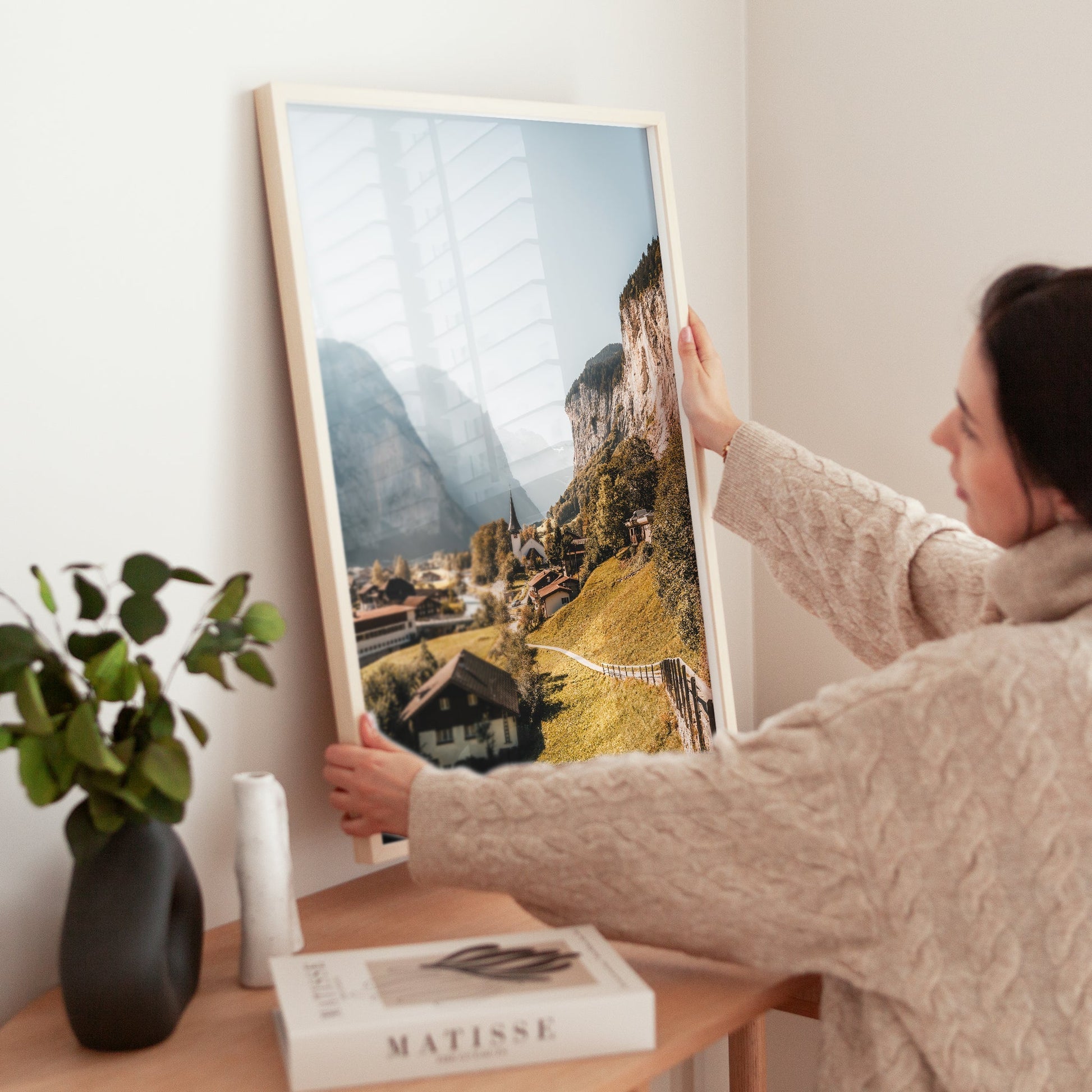 Dieses ungerahmte Kunstwerk fängt die spektakuläre Lauterbrunnen-Landschaft mit lebendiger Farbtreue ein und verleiht jedem Raum eine ruhige, inspirierende Atmosphäre. Die präzise Detaildarstellung von Felsen, Wasserfällen und Chalets macht den Druck zum Blickfang in Wohnräumen, Büros oder Galerien und lädt zum Träumen von den Schweizer Alpen ein.