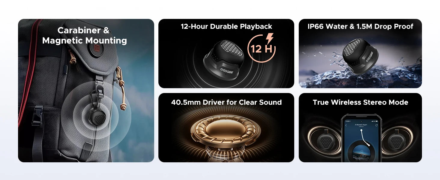 Der DOOGEE SnapBeat ist ein kompakter, magnetischer Bluetooth-Lautsprecher, der kraftvollen Klang und lange Laufzeit in einem ultrakompakten Gehäuse vereint. Mit seiner magnetischen Halterung lässt er sich flexibel an fast jeder metallischen Oberfläche befestigen – ideal für Outdoor-Aktivitäten, Büro-Umgebungen oder spontane Musikmomente zu Hause. Er koppelt sich schnell per Bluetooth, liefert satten Stereo-Sound und kommt ohne komplizierte Apps aus. So genießen Sie jederzeit klare Musik, Anrufe in Freisprechqualität und mühelose Bedienung – egal wo Sie sind.