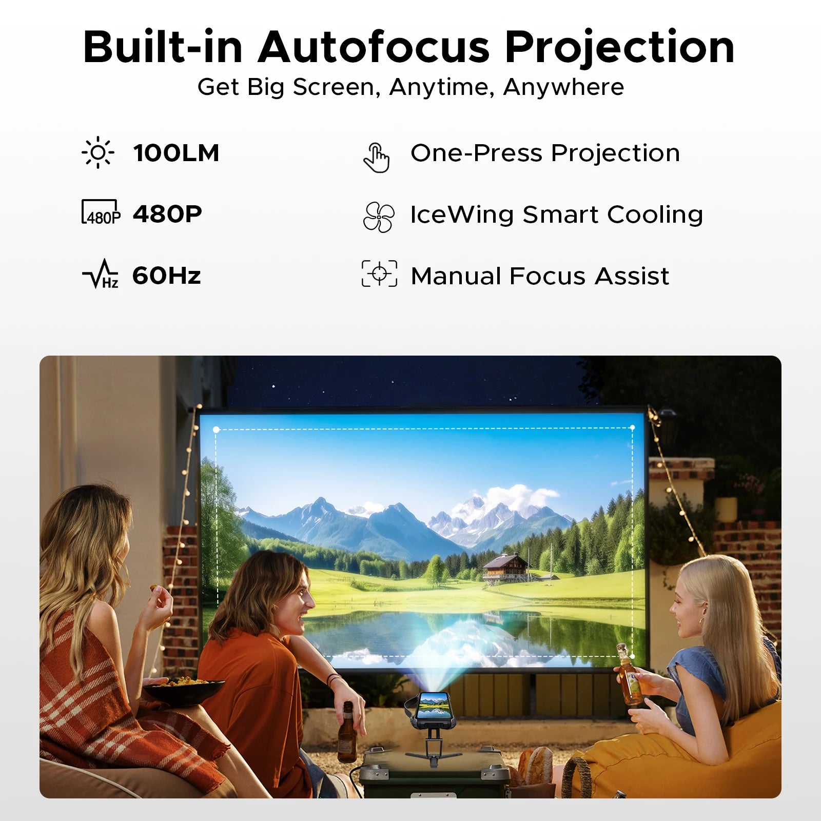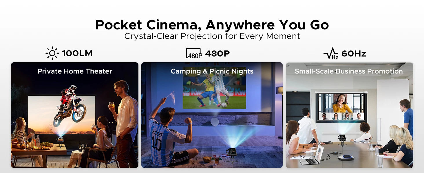 - 80+ Zentimeter Projektion bei passenden Umgebungsbedingungen – ideal für spontane Kinoabende oder Präsentationen unterwegs