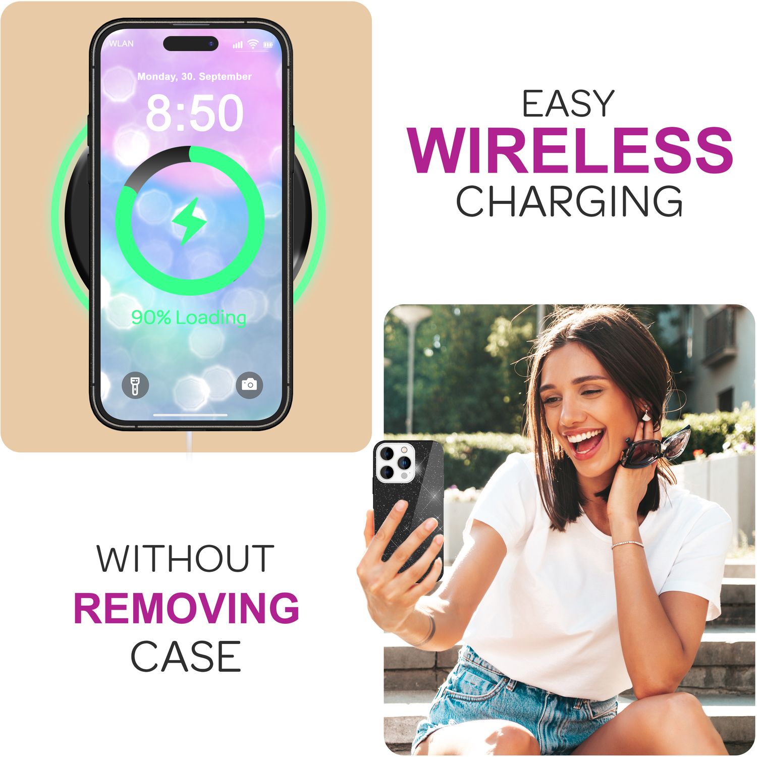 Natürlich kannst du dein Smartphone kabellos aufladen, ohne die Hülle zu entfernen. Die ShinePop Hülle vereint Glamour, Schutz und Funktionalität auf höchstem Niveau – ein Must-have für alle, die es lieben, zu glänzen!