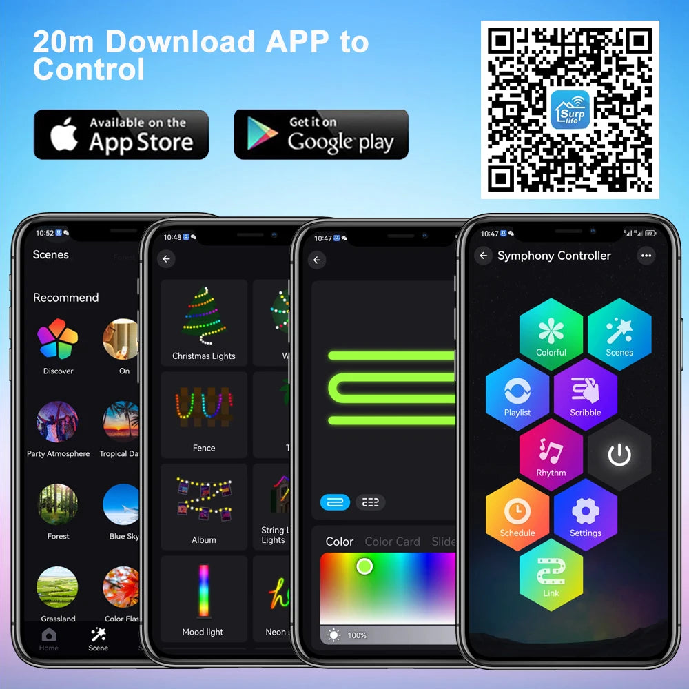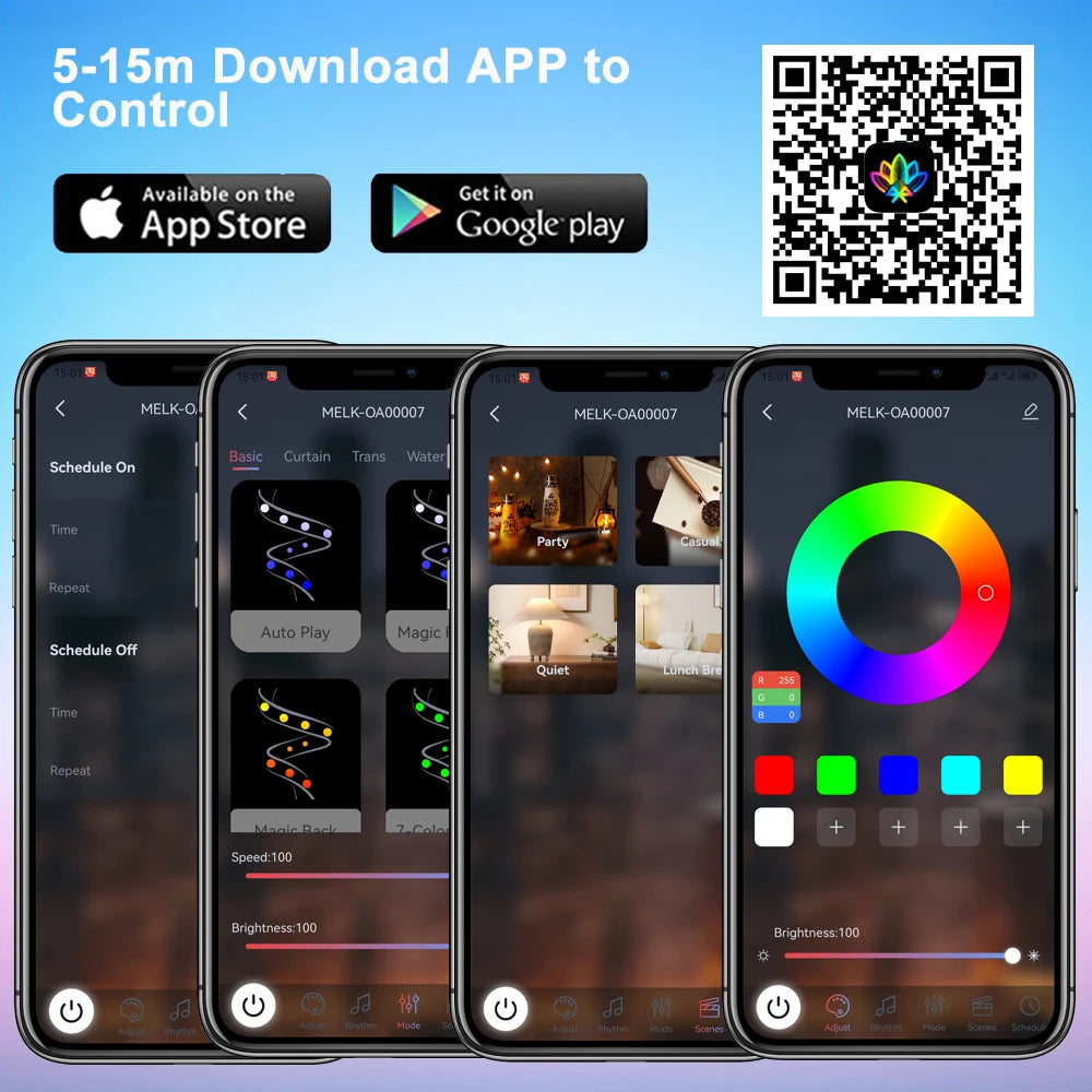 - Intuitive Smartphone-App zur Auswahl von Farben, Mustern, Helligkeit und Timer-Funktionen.