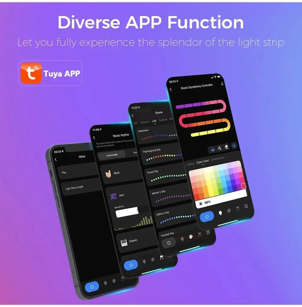 - Steuerung: Tuya App, Musik-Rhythmus, IR-Fernbedienung