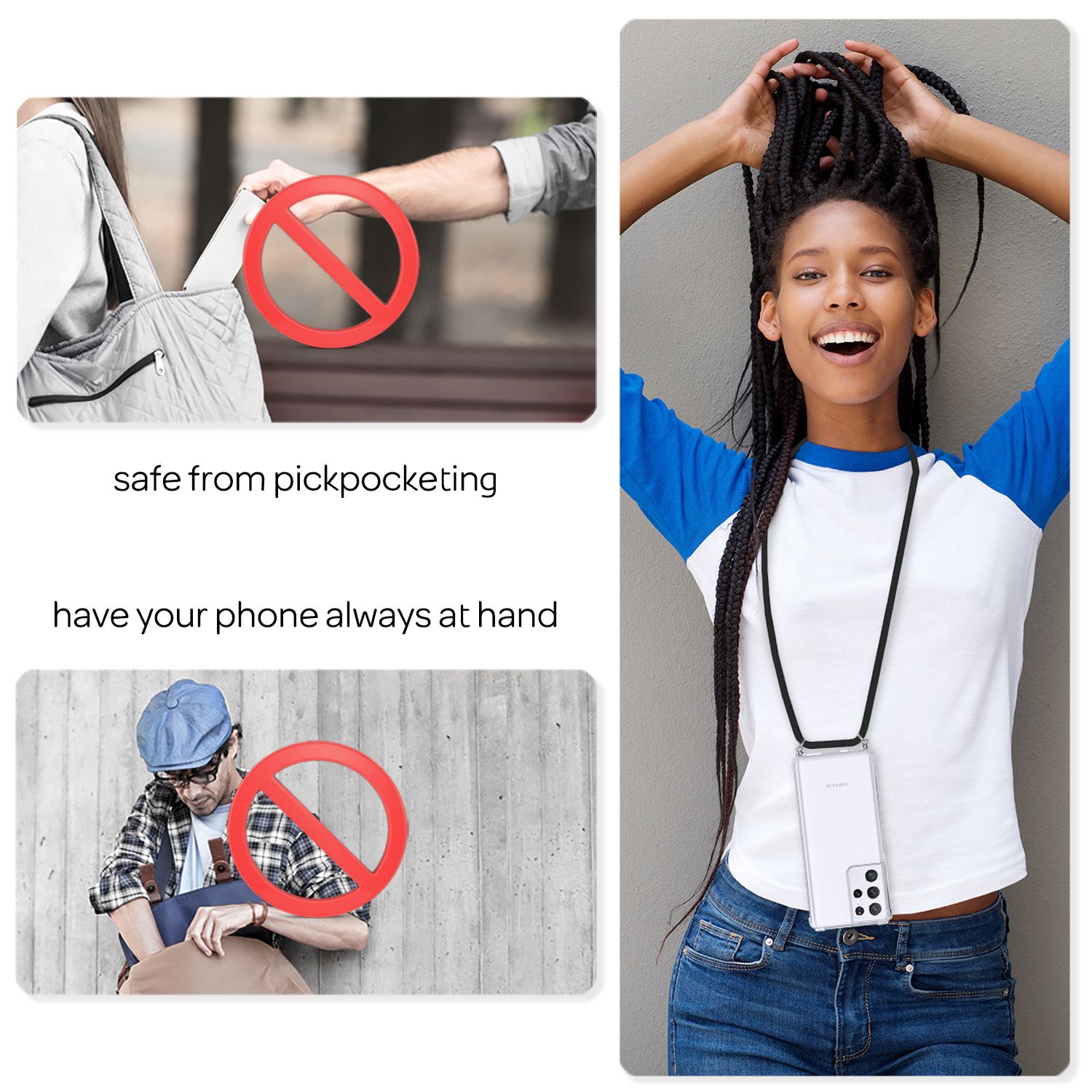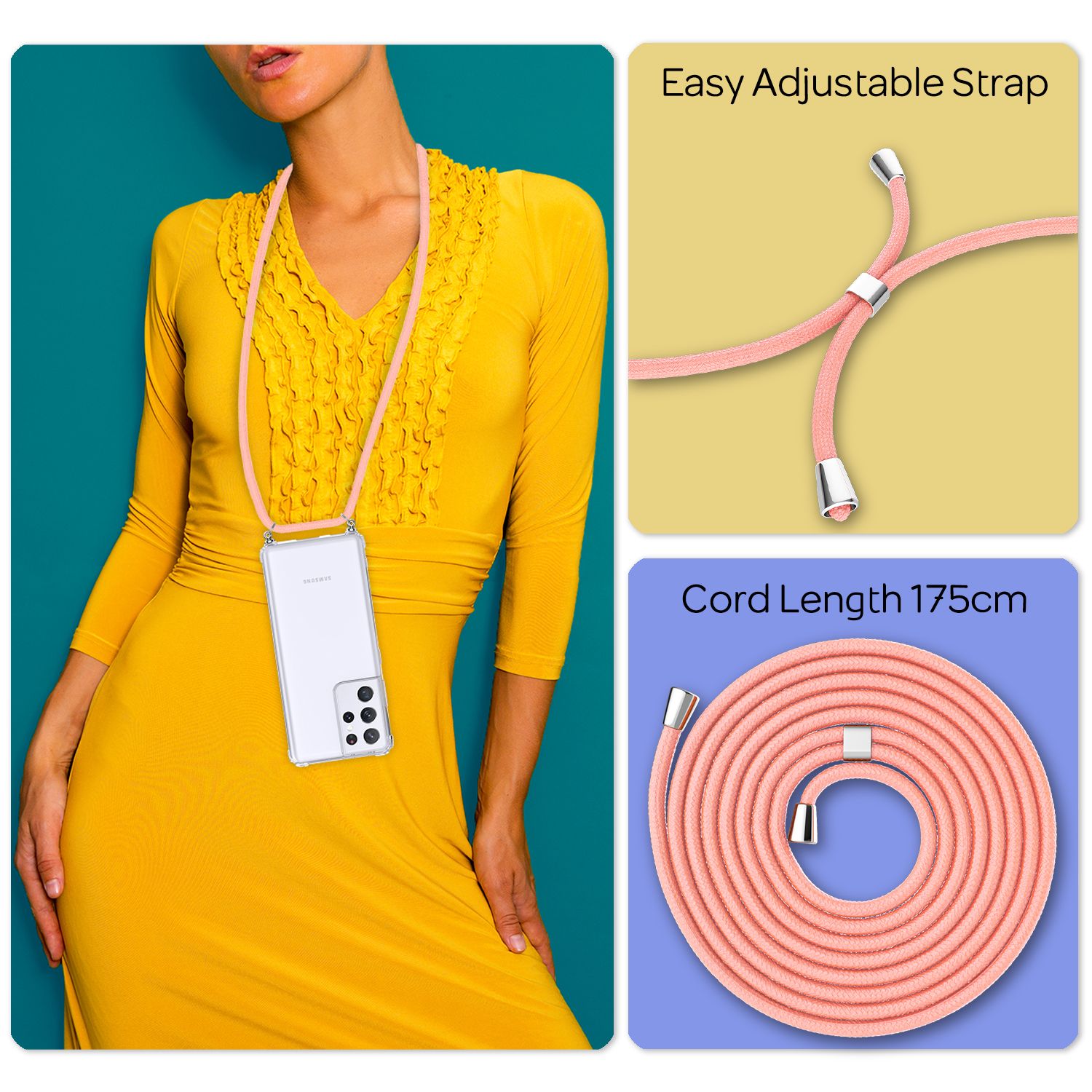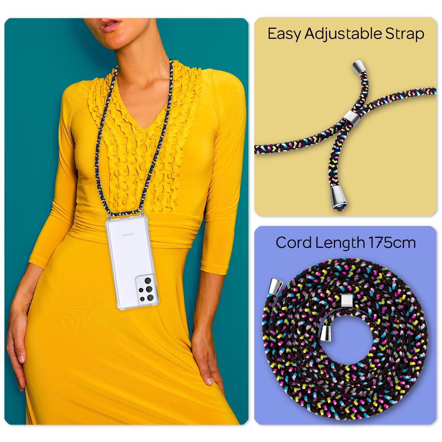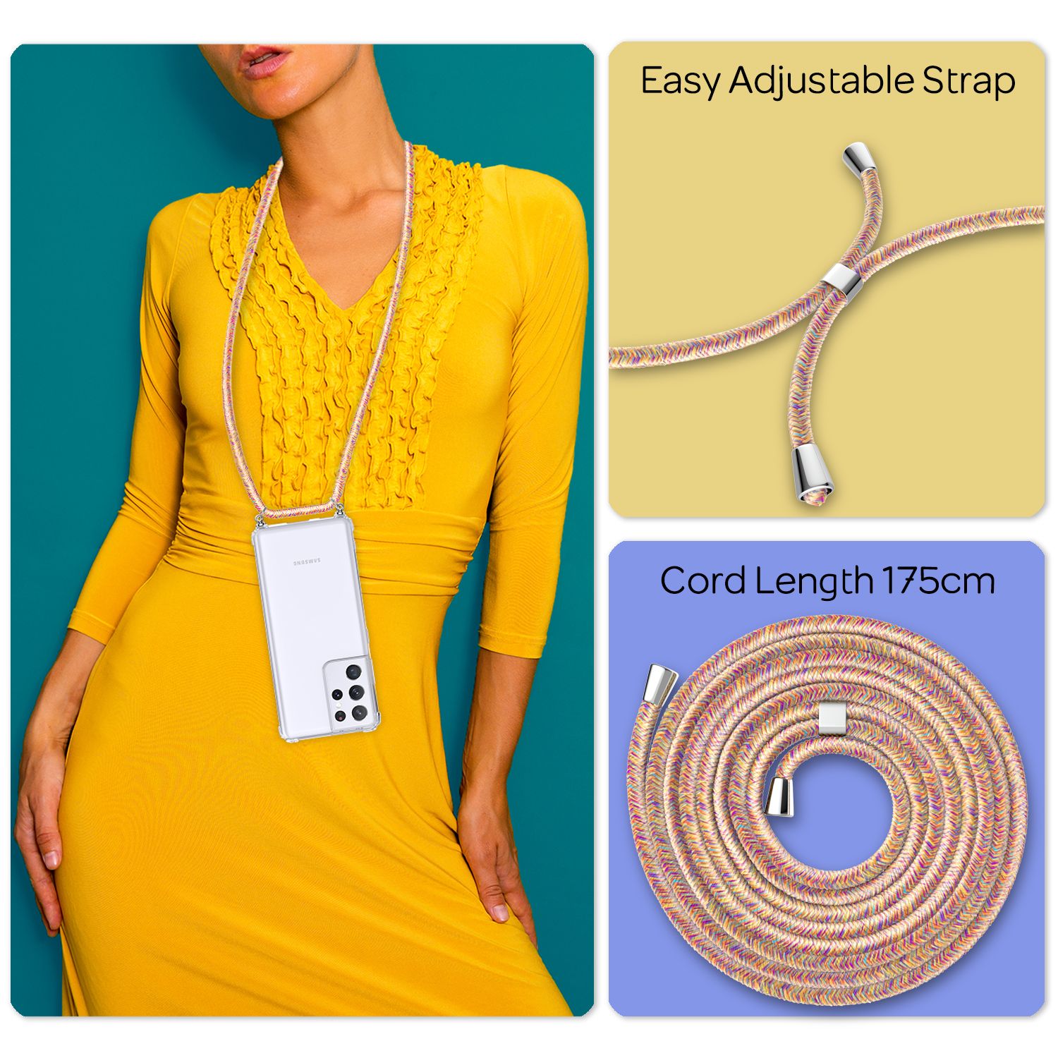 Das 150 cm lange Handyband ist angenehm zu tragen und extra widerstandsfähig gegen Verheddern. Du kannst dein Smartphone flexibel über der Schulter, um den Hals oder als Crossbody tragen – je nachdem, was für dich am besten passt.
