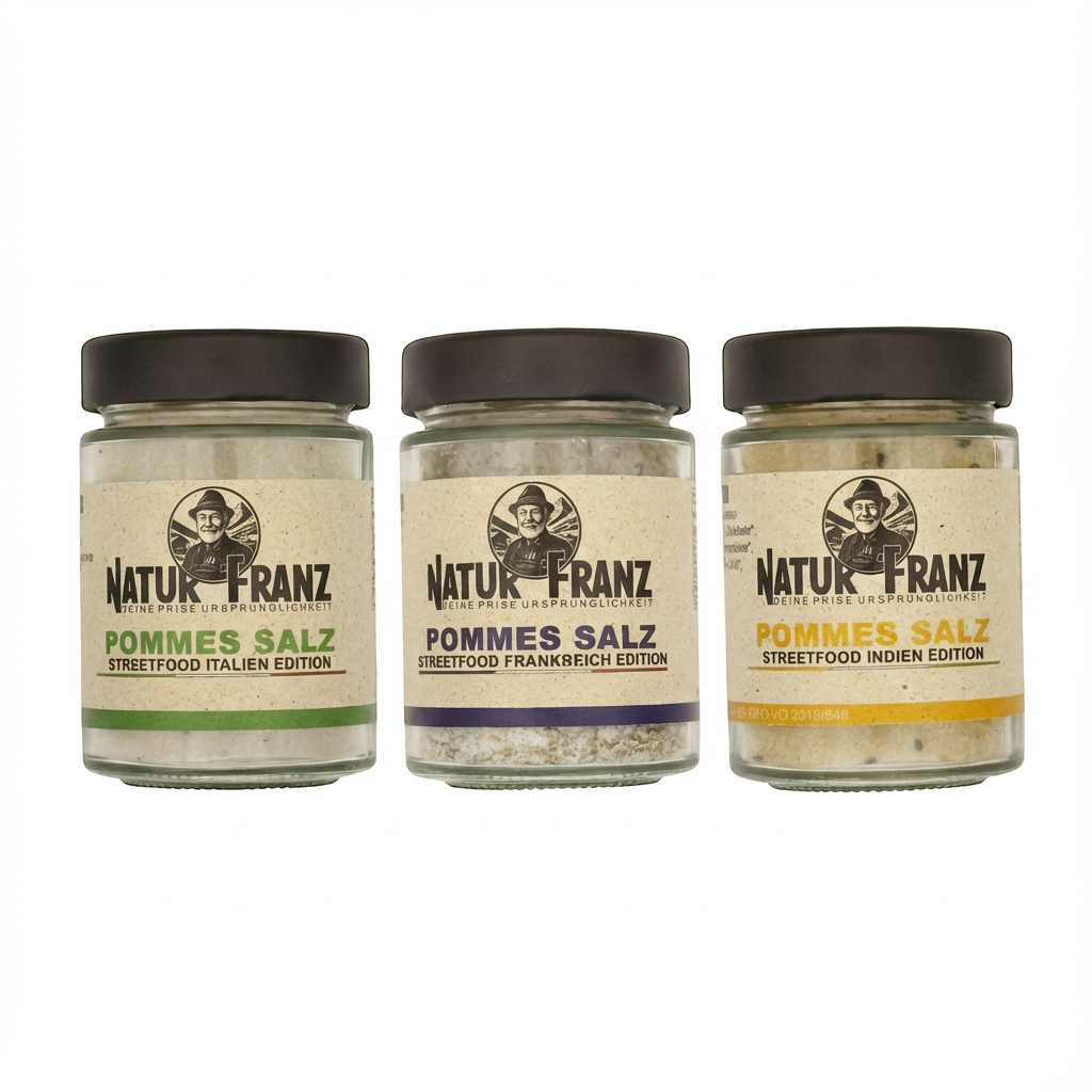 Die Trilogie der Streetfood-Kulturen in einem Bundle: Frankreich, Italien und Indien vereint in drei einzigartigen Pommes Salzen, die deine Küche auf Knopfdruck in einen duftenden Streetfood-Markt verwandeln. Drei Welten, drei Aromen – unendlich viel Genuss.