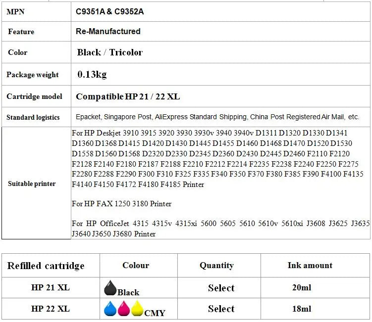 - Produkttyp: Nachgefüllte Tintenpatronen (kompatibel mit HP21 / HP22)