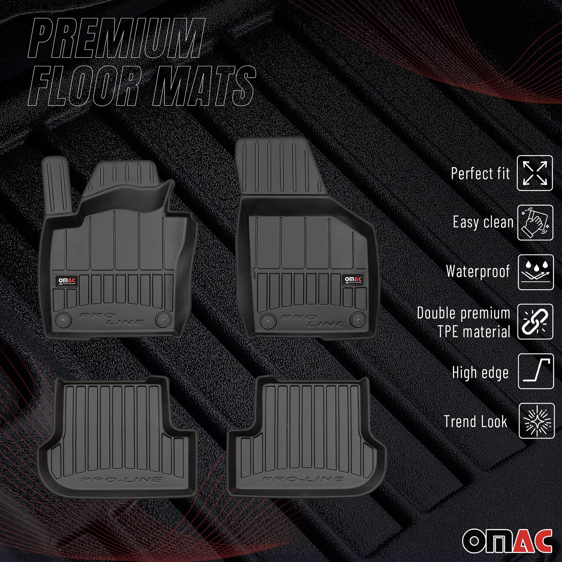 Unsere Premium-TPE-Fußmatten bieten einen Allwetterschutz und sind somit für jede Jahreszeit und jedes Klima geeignet. Ob im heißen Sommer oder im schneereichen Winter, diese Matten halten den Anforderungen stand und schützen Ihren Innenraum vor witterungsbedingten Schäden. Genießen Sie Luxus mit ihrem raffinierten Aussehen, das den Innenraum Ihres Fahrzeugs in neue Höhen der Raffinesse hebt. Diese leicht zu reinigenden und zu pflegenden Fußmatten sind eine praktische und stilvolle Ergänzung für jedes Fahrzeug.