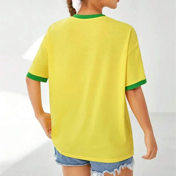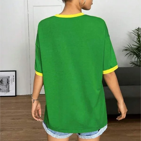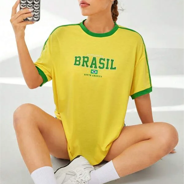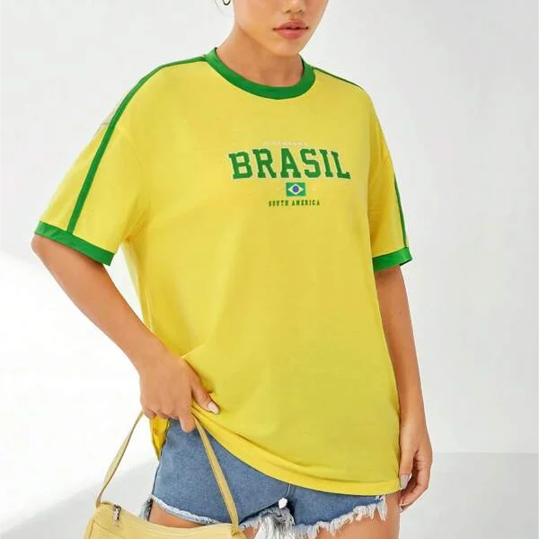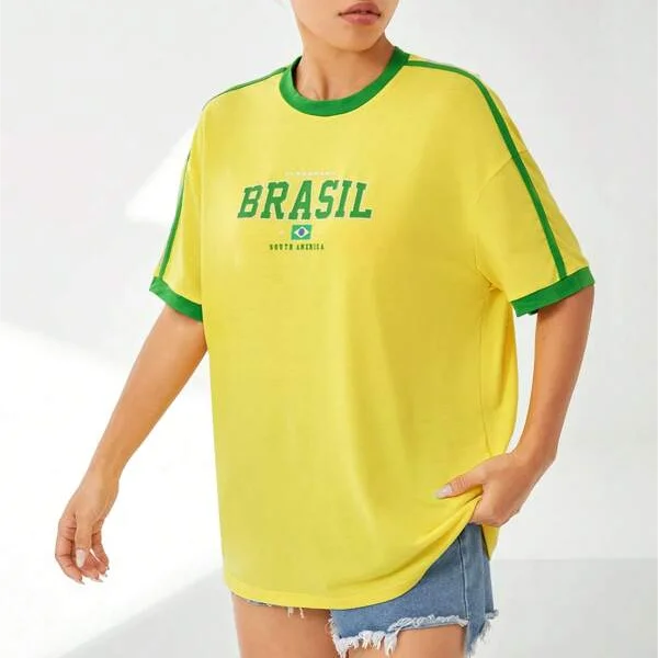 ZSSKASLCN Damen T Shirt Brasil Print - Grün Gelb Slim – Auffälliges Letter-Print für deinen Sommerlook