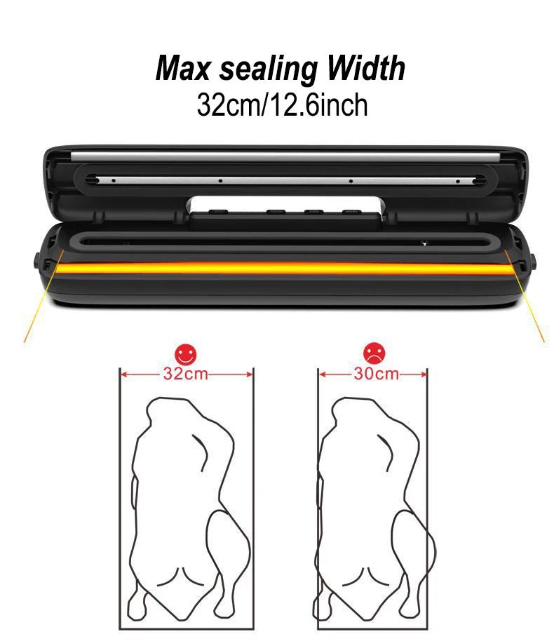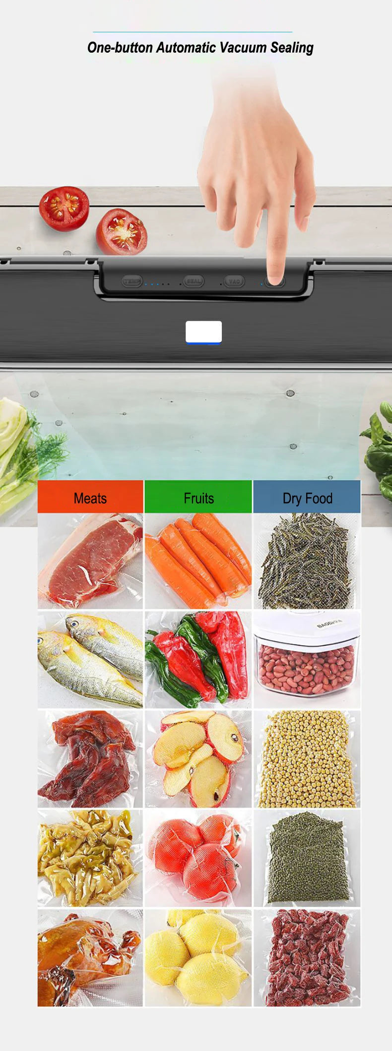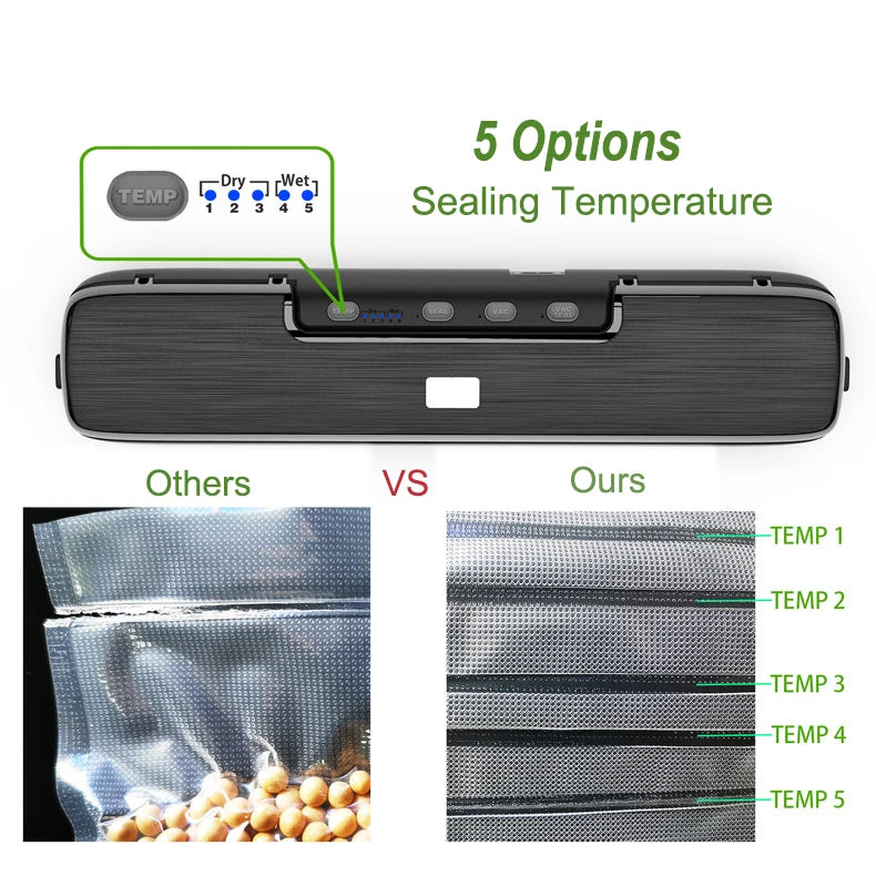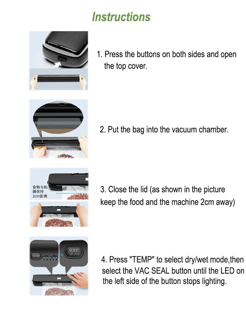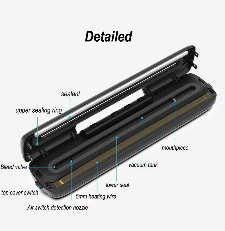 - Schnelle Versiegelungszyklen sparen Zeit beim Vorbereiten von Mahlzeiten und Vorräten.