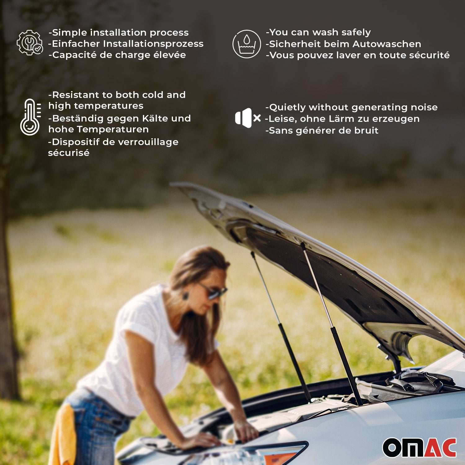 - Sicherheit geht vor: Die hydraulische Technologie sorgt für ein sicheres und stabiles Öffnen der Haube, wodurch das Risiko unerwarteter Schließungen und möglicher Verletzungen verringert wird.
