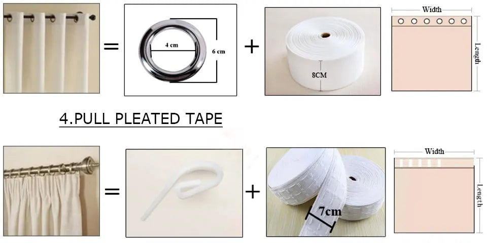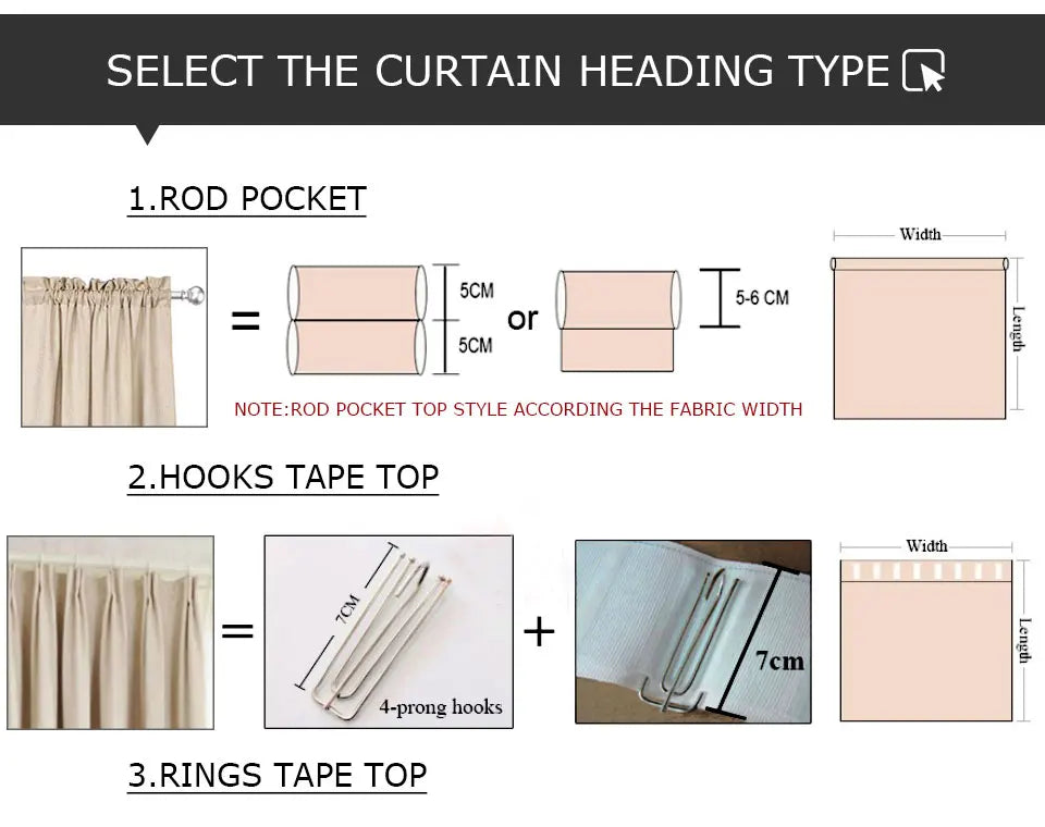 - Verarbeitungsmethoden: rings top, hooks top, pull pleated tape, rod pocket
