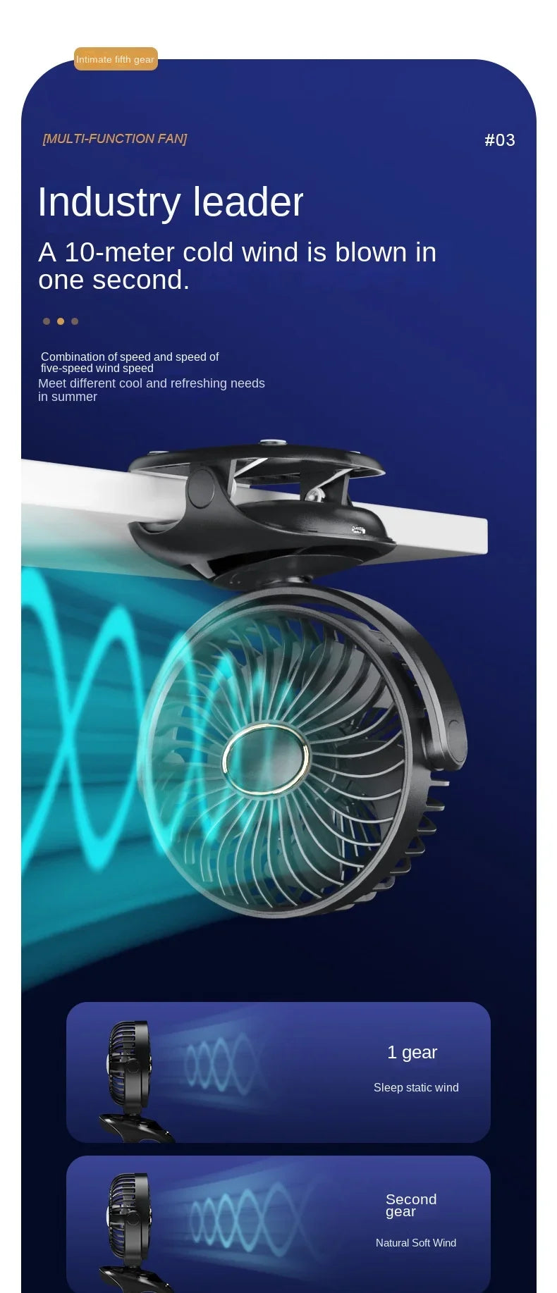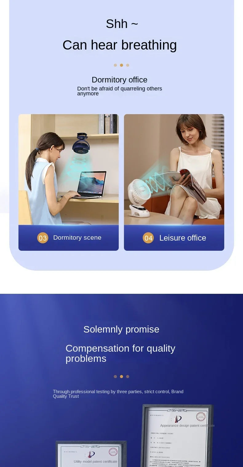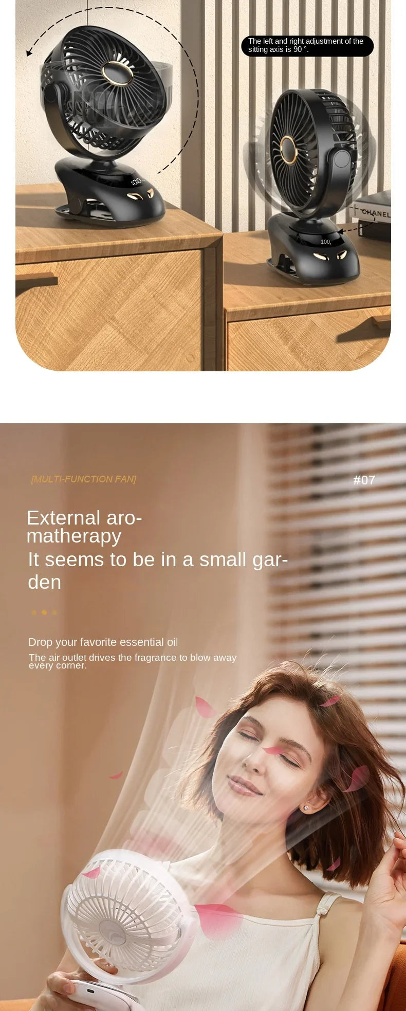 Leistungsstarke, mobile Kühlung mit flexibler Befestigung: kompakt, wiederaufladbar und ideal für Schreibtisch, Bett oder Outdoor-Einsatz.
