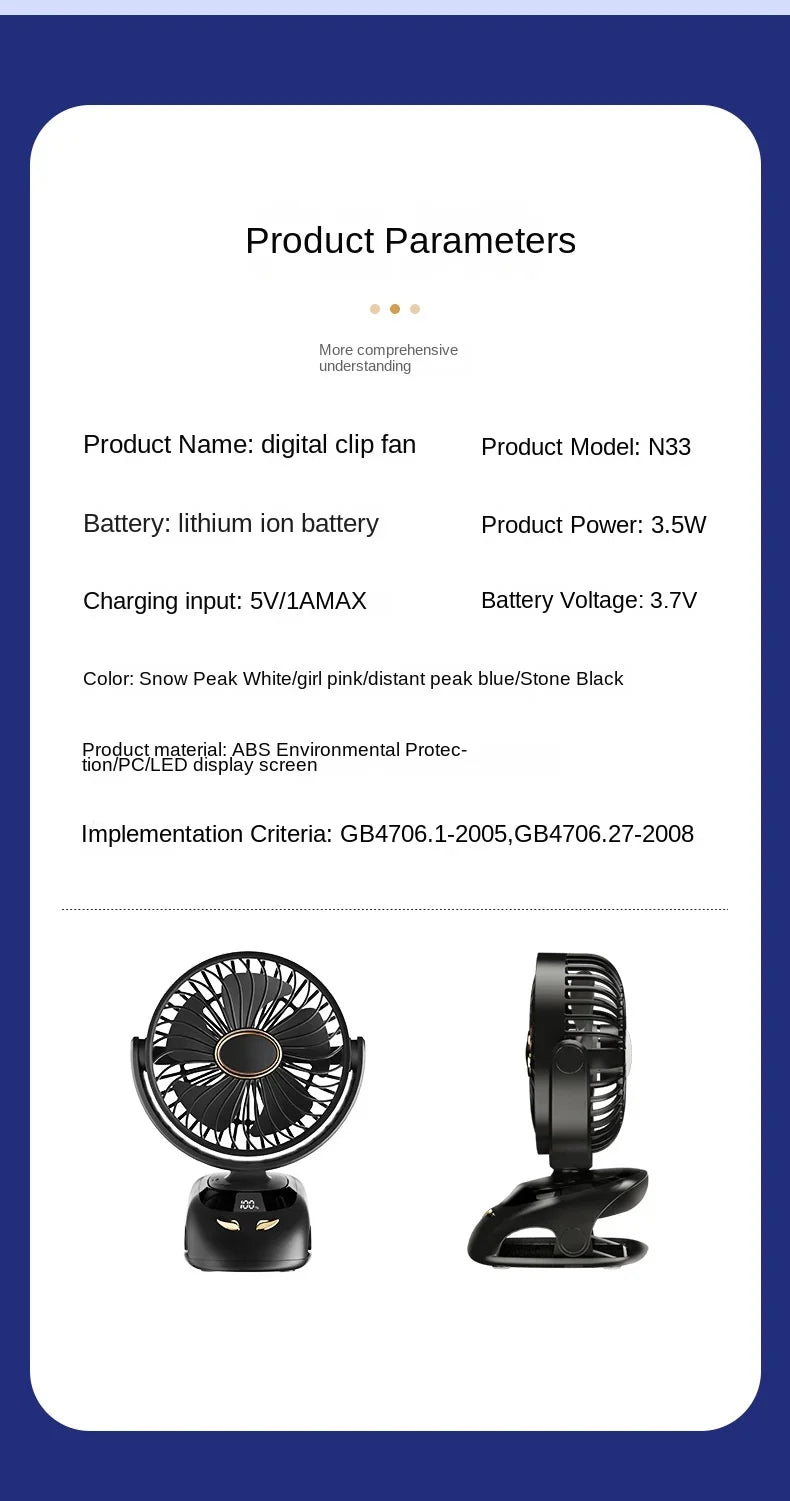 Dieses kompakte Clip-Ventilator-Modell bietet eine überzeugende Kombination aus Mobilität, Leistung und Bedienkomfort. Durch die wiederaufladbare Batterie und die vielseitigen Befestigungsoptionen ist es eine praktische Ergänzung für jeden Haushalt und für unterwegs. Die einfache Bedienung, das leise Betriebsgeräusch und die robuste Ausführung machen das Gerät zu einer zuverlässigen Lösung für punktuelle Kühlung, ohne aufwändige Installation oder permanente Stromversorgung. Ideal für Nutzer, die ein handliches, effizientes und flexibles Kühlgerät suchen, das sich problemlos in den Alltag integrieren lässt.