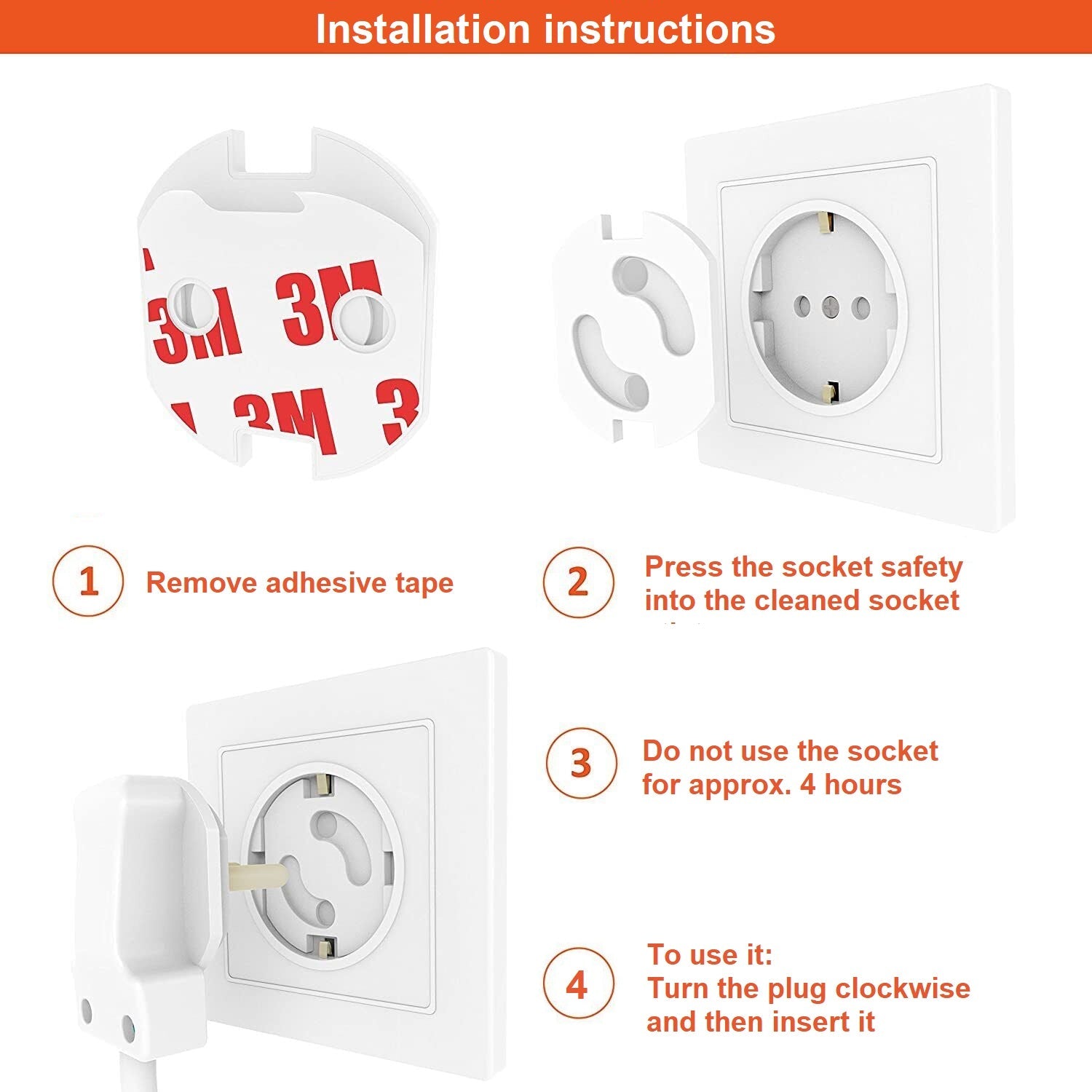 - Selbstklebende Kindersicherung mit Drehmechanismus: Lässt sich nur bewegen, wenn beide Öffnungen gleichzeitig mit einem Stecker gedreht werden.