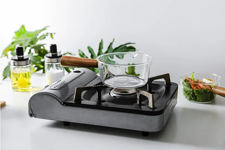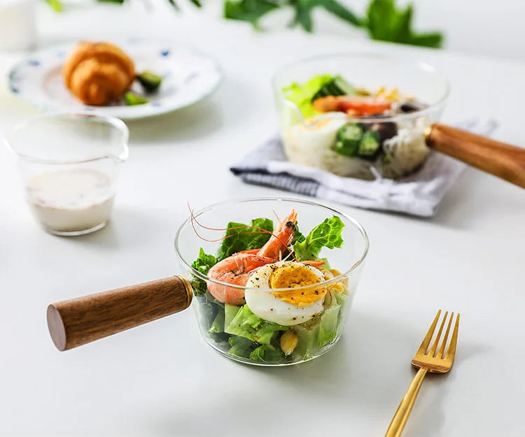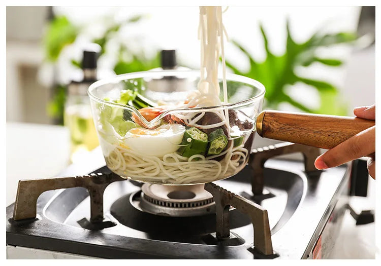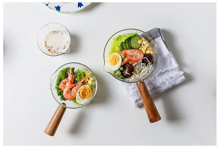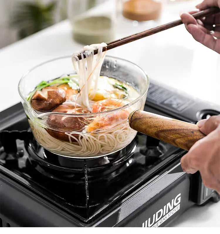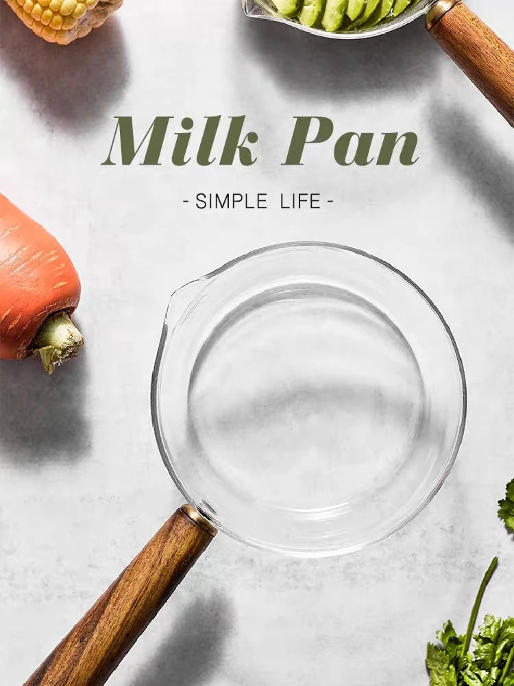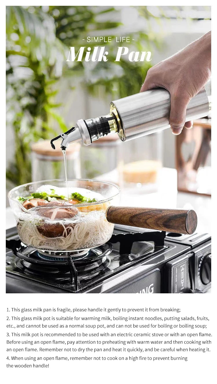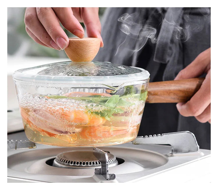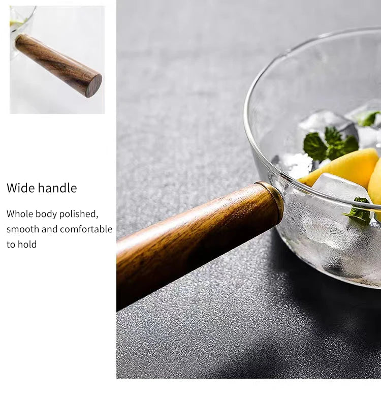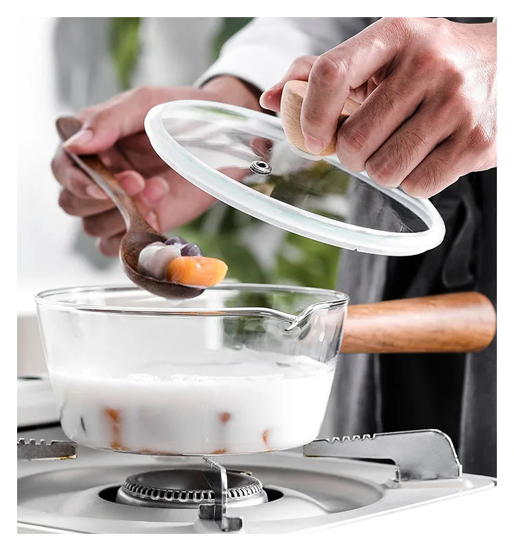 Ein eleganter, hitzebeständiger Glas-Milchtopf mit ergonomischem Holzgriff für gleichmäßiges Erwärmen von Milch, Saucen und Suppen – sichtbar, kontrollierbar und leicht zu reinigen.