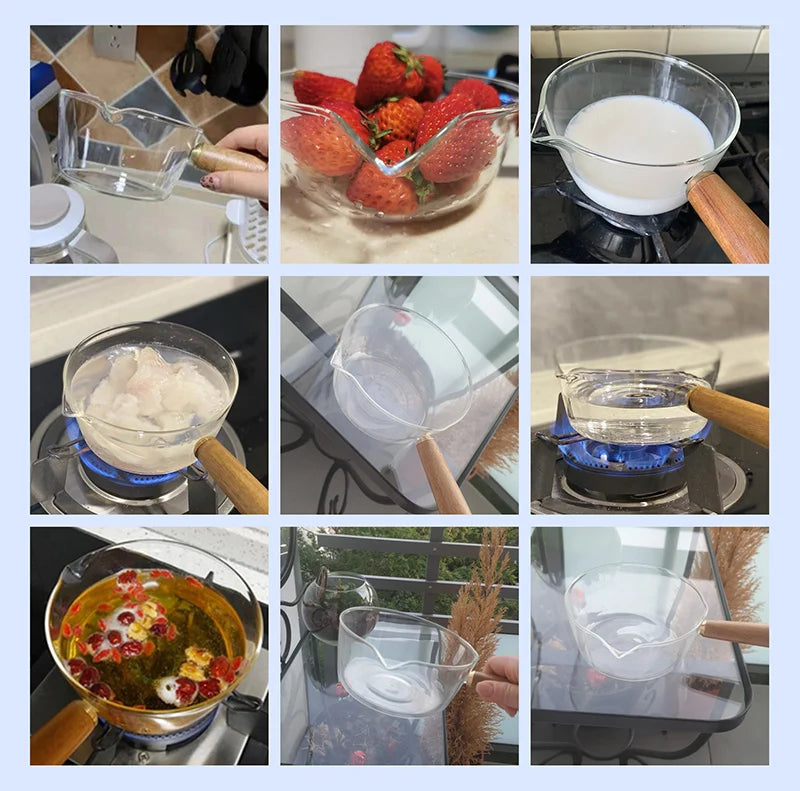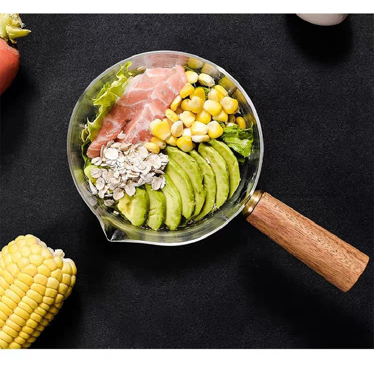 KEMORELA YS7258 Glasmilchtopf mit Holzgriff – Präzises und sicheres Erhitzen für Küche und Haushalt