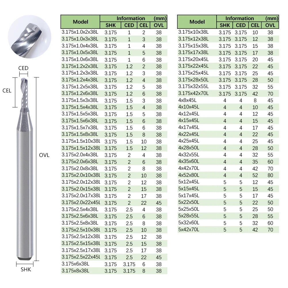 HOZLYCED Singleflute Spiralfräser - Ø3.175-8mm 38-80mm