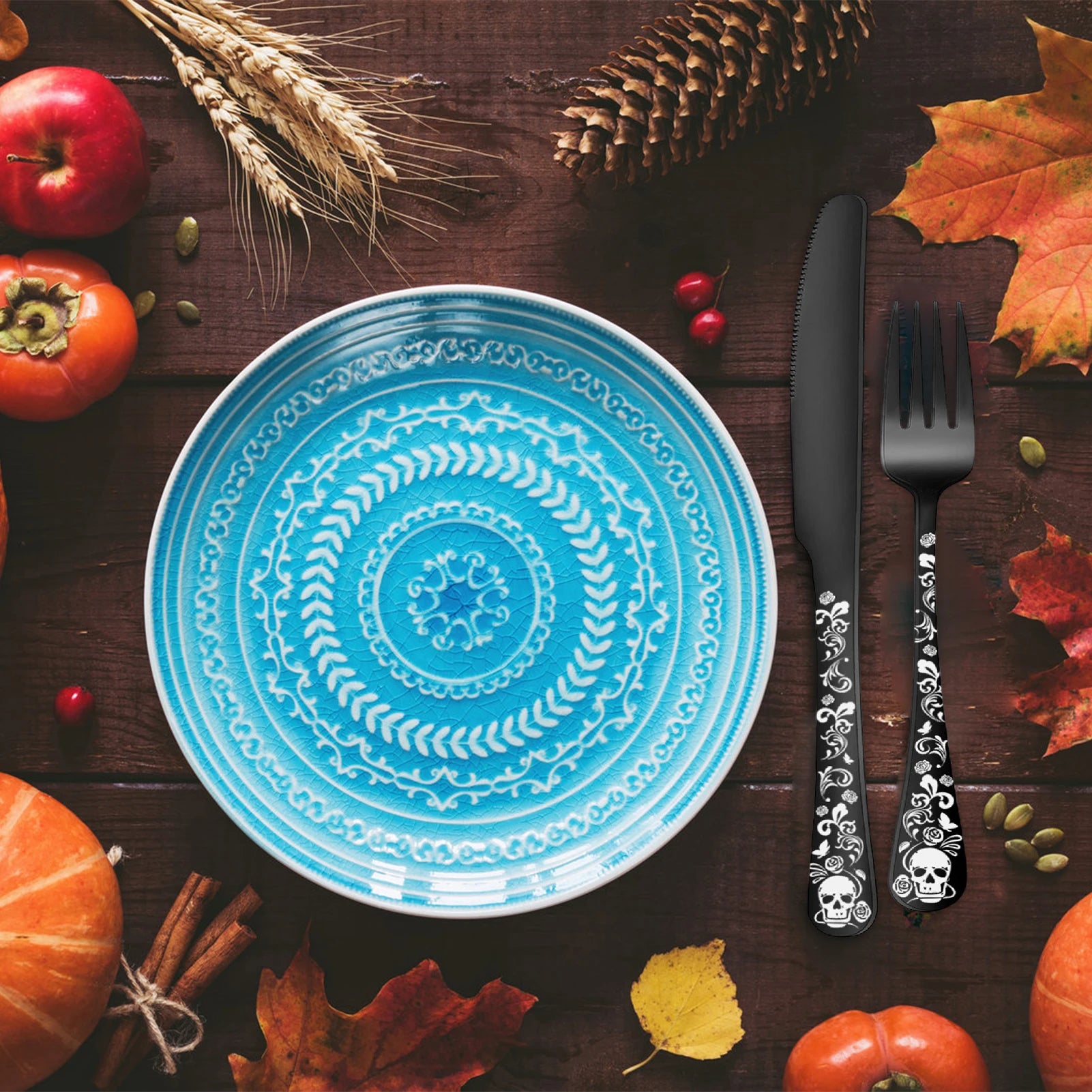 - Markantes Schädel-Motiv auf Griffen sorgt für einen unverwechselbaren Look, ideal für Halloween, Gothic-Dinner oder thematische Partys.