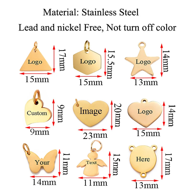 - 5 x polierte Edelstahl-Anhänger (Formen können Herz, Stern, Dreieck, Schmetterling, Oval umfassen)
