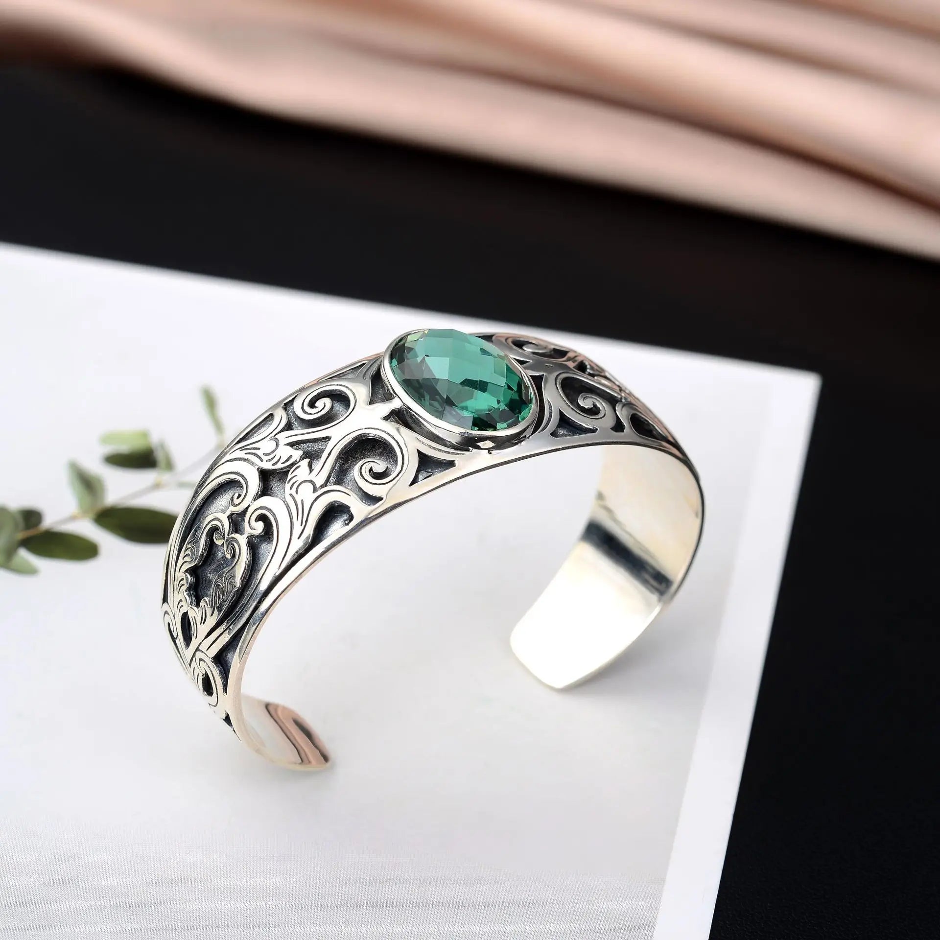 At its center lies a striking 18x13mm green crystal, precisely inlaid to enhance its brilliance and offer a captivating focal point. The bracelet’s generous 22mm width and 55mm adjustable diameter ensure both style and comfort, making it suitable for daily wear or special occasions.