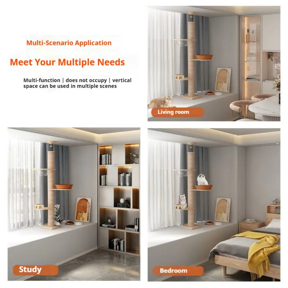 Adjustable Cat Tree House Tower Multi-function Floor To Ceiling Wooden House Tower Soft with Pet Condo Flannel Hammock Bed
