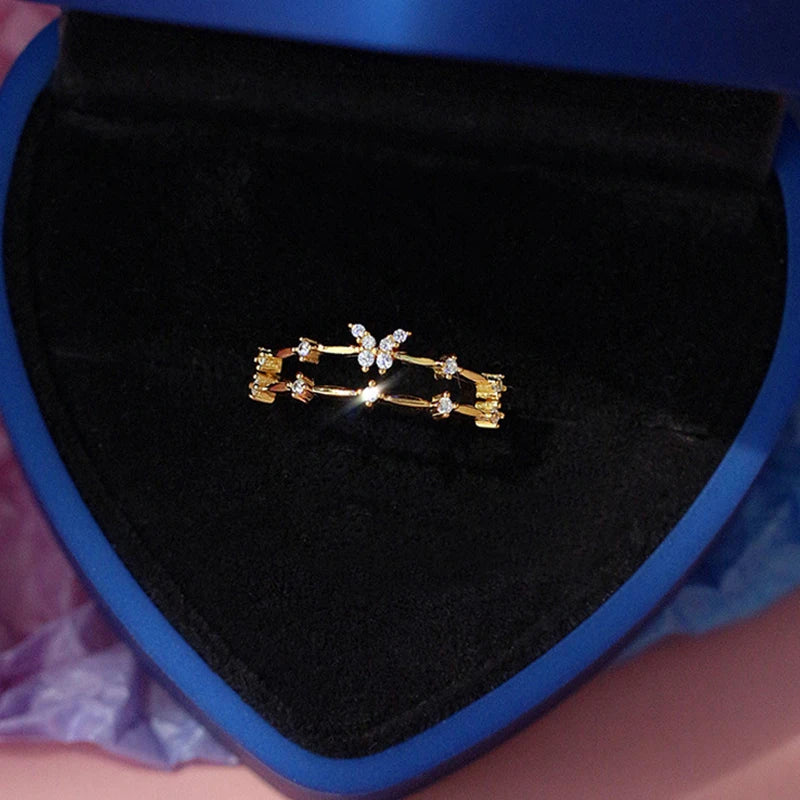 Dieser doppellagige, verstellbare Ring verbindet funkelnde Zirkonia mit filigranem Schmetterlingsmotiv und verleiht Ihrem Outfit sofort luxuriösen Glanz und feminine Raffinesse.