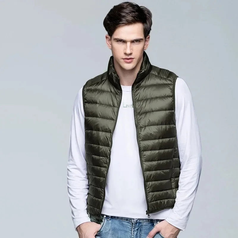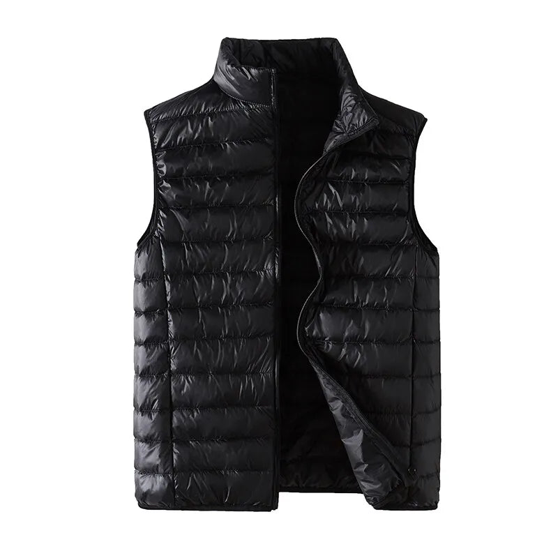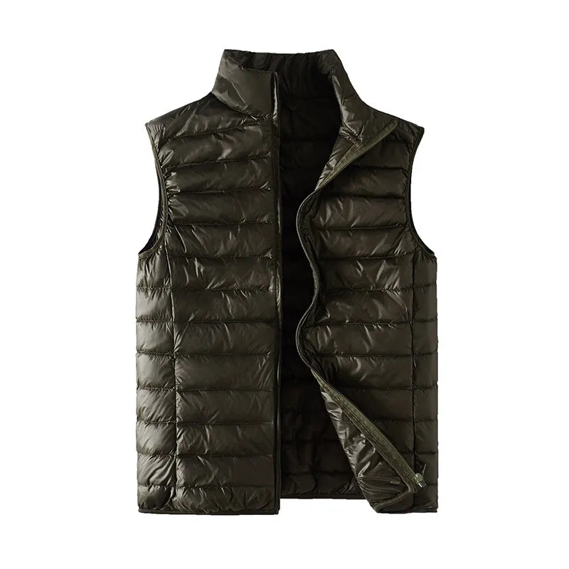 Diese leichte, ärmellose Herren-Weste mit Stehkragen verbindet minimalistisches Design mit funktionaler Leichtigkeit und bietet zuverlässige Wärme für Alltag und Freizeit.