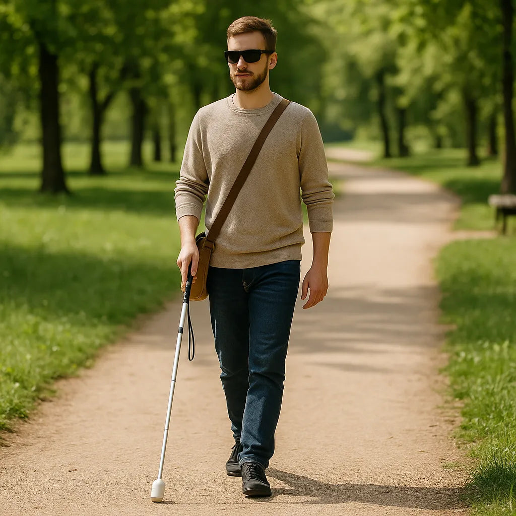 Der Gehstock bietet eine sichere Mobilitätslösung und schützt durch frühzeitiges Ertasten von Hindernissen. Dies ermöglicht eine rechtzeitige Reaktion und verhindert Zusammenstöße. Voraussetzung ist das Erlernen der richtigen Handhabung durch einen Mobilitätstrainer.