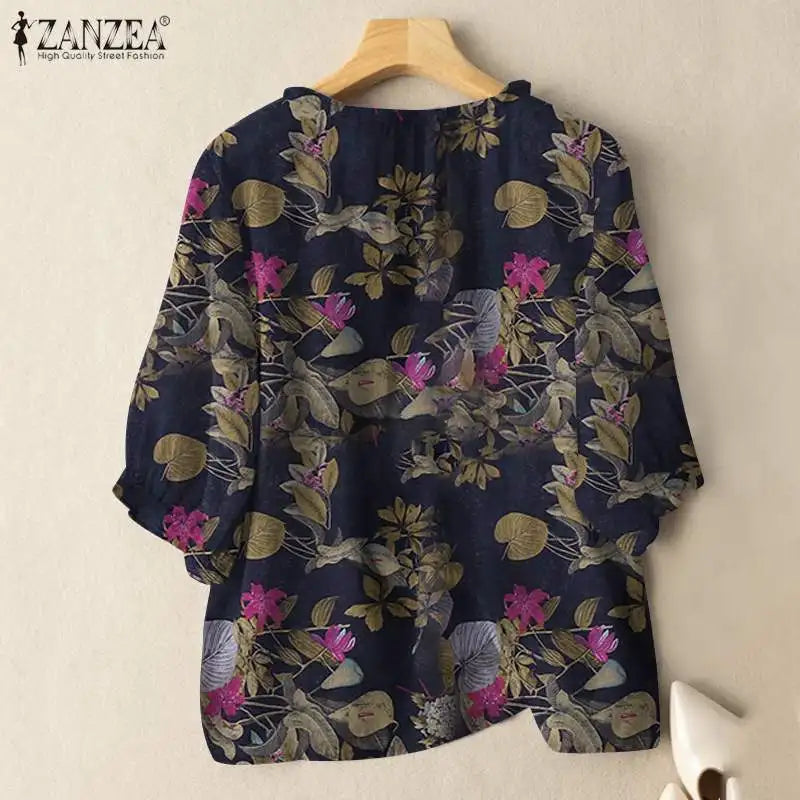 Bohemian Ruffles Tunic Shirt Work Blusas ZANZEA Women Summer O Neck 3/4 Sleeve Tops Casual Mujer Vintage Floral Printed Blouse
