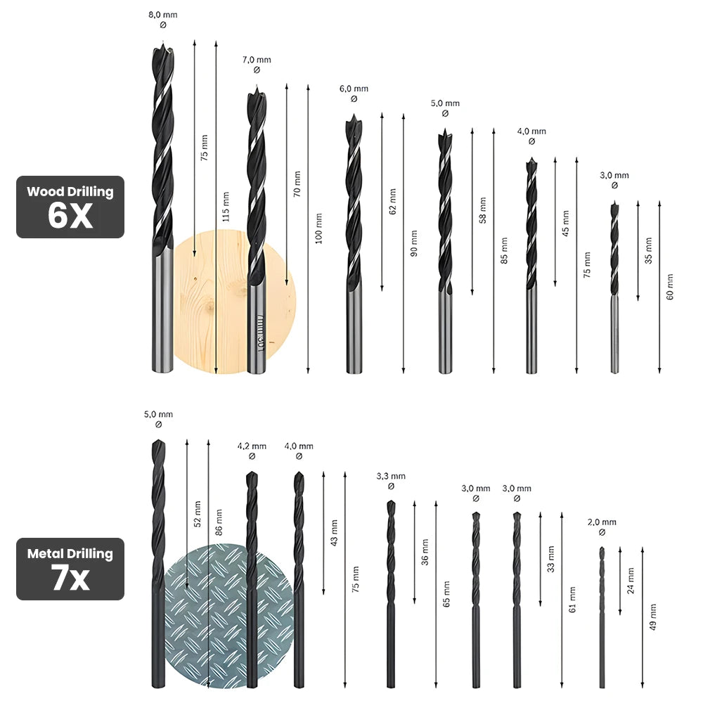 - Material: High-Speed Steel (HSS) für Bohrer, gehärtete Stahllegierung für Bits