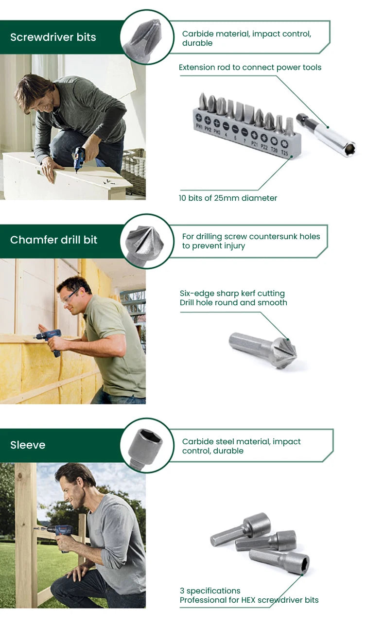 - Schneller Wechsel: Kombination aus Bohrern und Schrauberbits ermöglicht effizienten Arbeitsprozess ohne langes Suchen nach passenden Teilen.