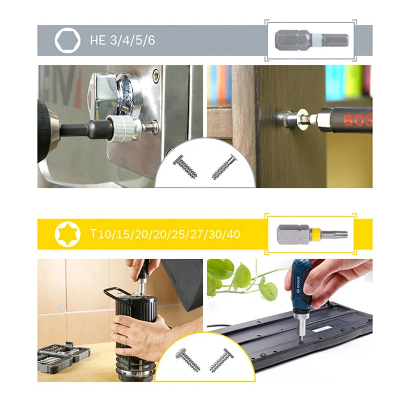 - Gepaarte Auswahl an Kreuz-, Schlitz- und Torx-Bits reduziert unsichere Improvisationen mit ungeeignetem Werkzeug.