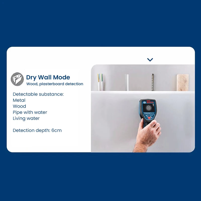 - Gezielte Erkennung von Metall, spannungsführenden Leitungen, Wasserrohren und Holzbalken reduziert das Risiko von Beschädigungen bei Bohrungen und Fräsarbeiten.