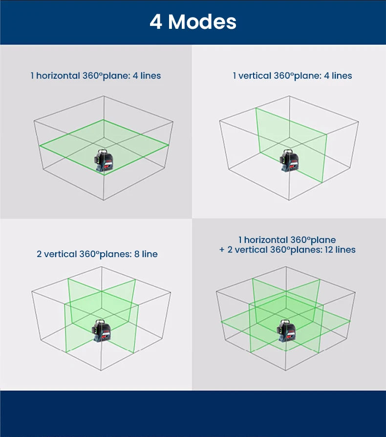 - Laserlinien: 12 (grün), inklusive 360° horizontale und vertikale Kreuzlinien