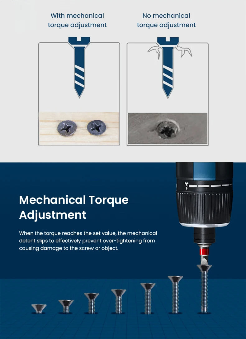 - Feinstufige Drehmomentsteuerung für exaktes Eindrehen von Schrauben in verschiedenen Materialien.