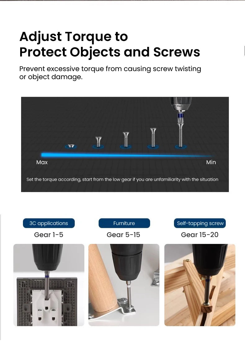 - Intuitive Steuerung mit leicht erreichbarem Schalter und Drehmoment-Einstellungen für schnelle Anpassung an verschiedene Aufgaben.
