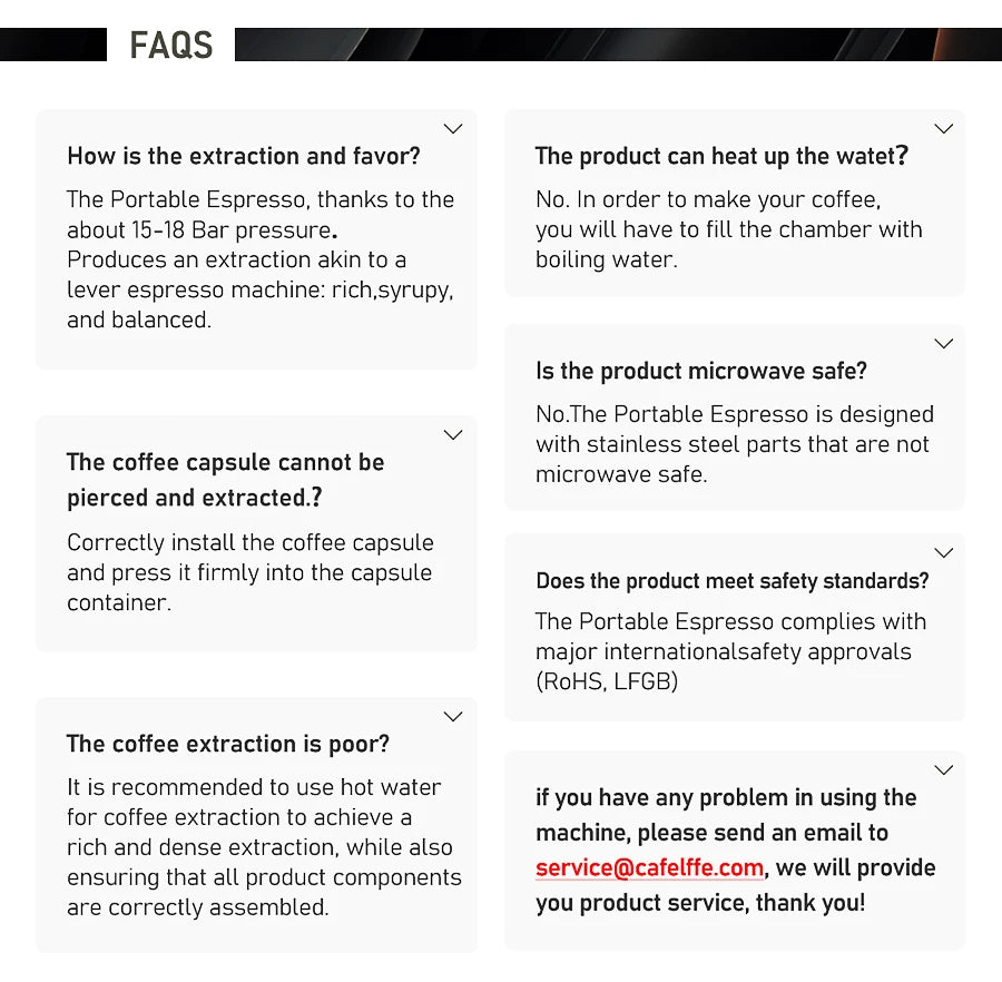 Die Cafelffe 3-in-1 Portable Coffee Machine bietet echten Kaffeekomfort jederzeit und überall: manuelle Espresso-Zubereitung, Kapsel- und Filteroptionen sowie Heiß- und Kaltwasserfunktion in einem kompakten, reisefreundlichen Gerät.