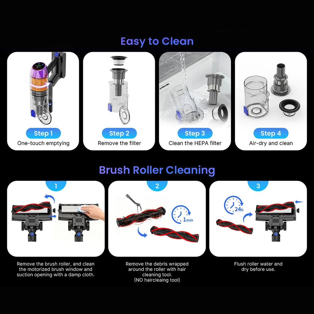 - Kabelloses Design beseitigt Kabelsalat, erhöht die Bewegungsfreiheit und sorgt für eine effiziente Reinigung selbst in schwer zugänglichen Bereichen.