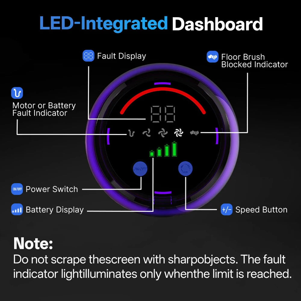 - Eine übersichtliche Anzeige informiert über Akkustand und Modus, damit Sie den Reinigungsablauf flexibel planen können.