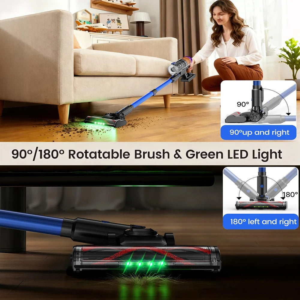 - Grün-LED-Licht am Bürstenkopf macht versteckten Staub sichtbar und erleichtert das gezielte Reinigen auch in dunklen Ecken.
