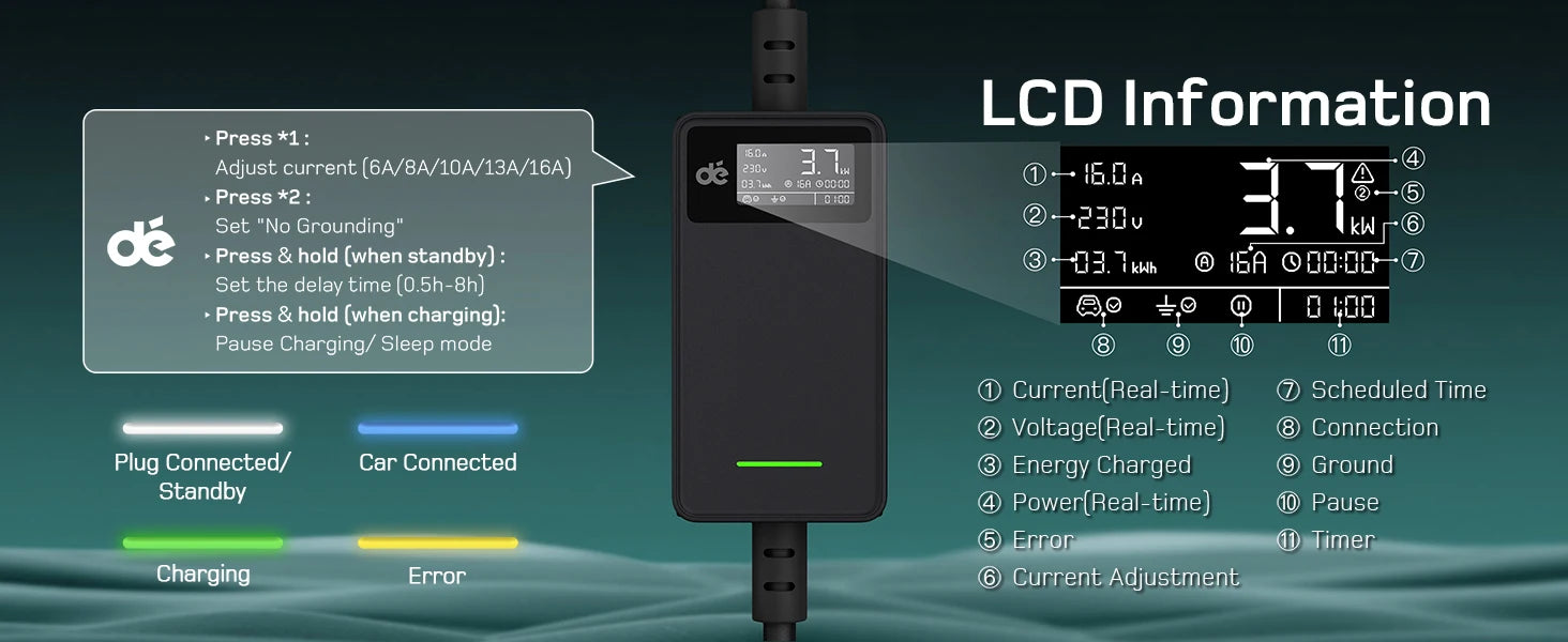 - Digitaldisplay: Anzeige von Stromstärke, geladener Energie (kWh) und Ladezeit