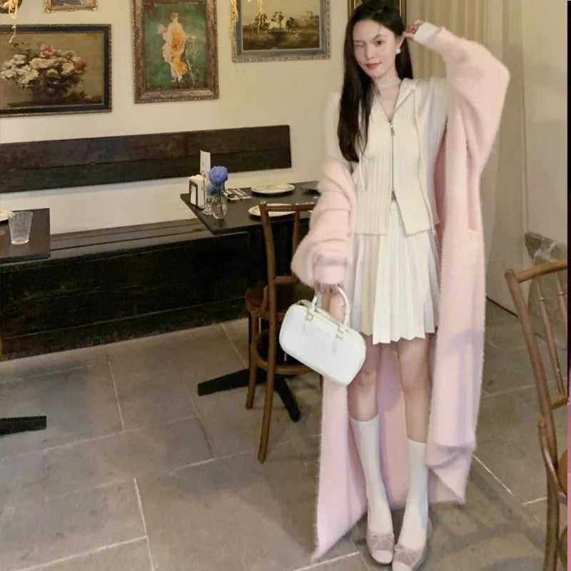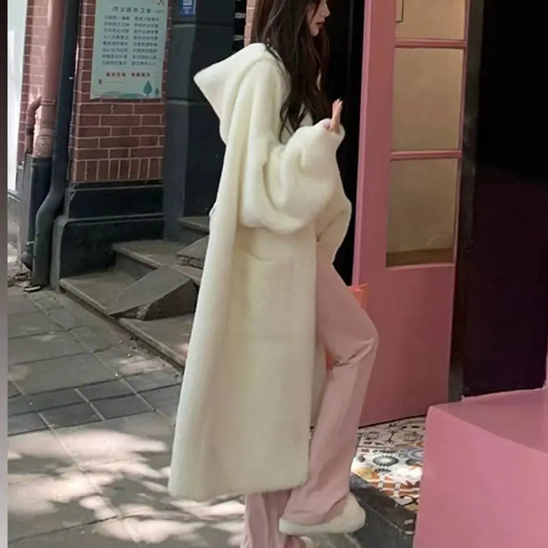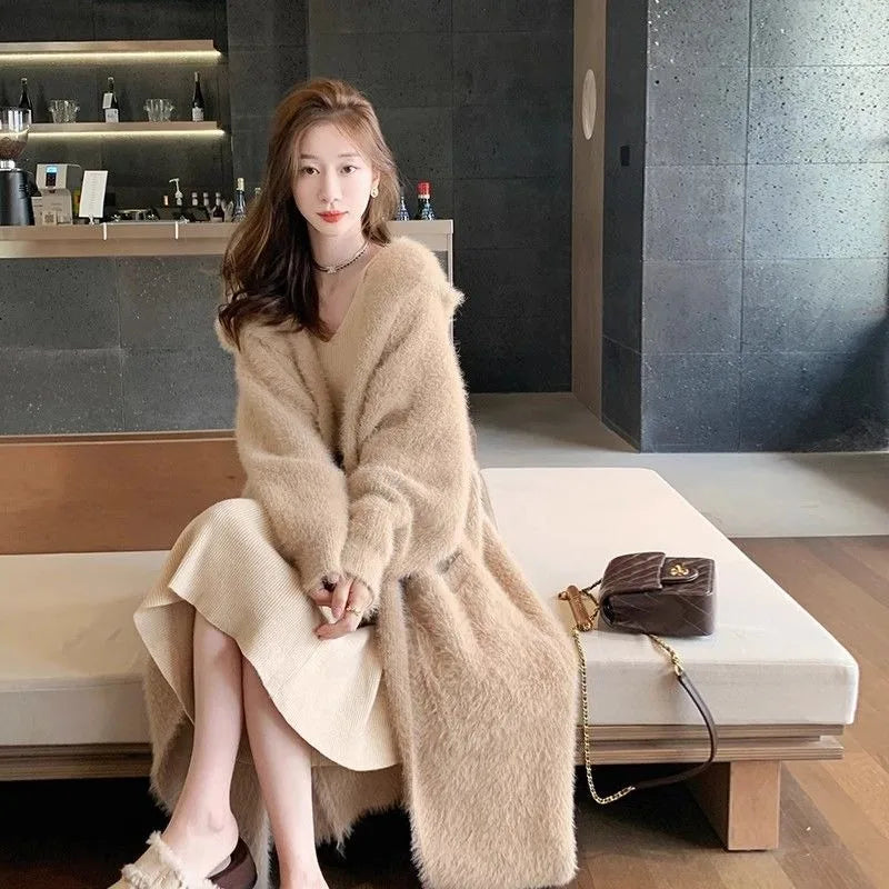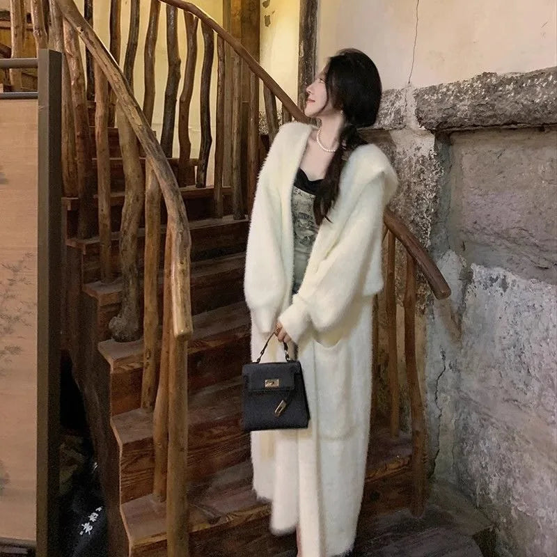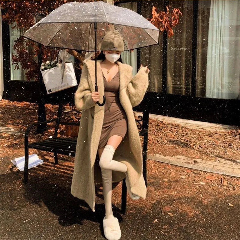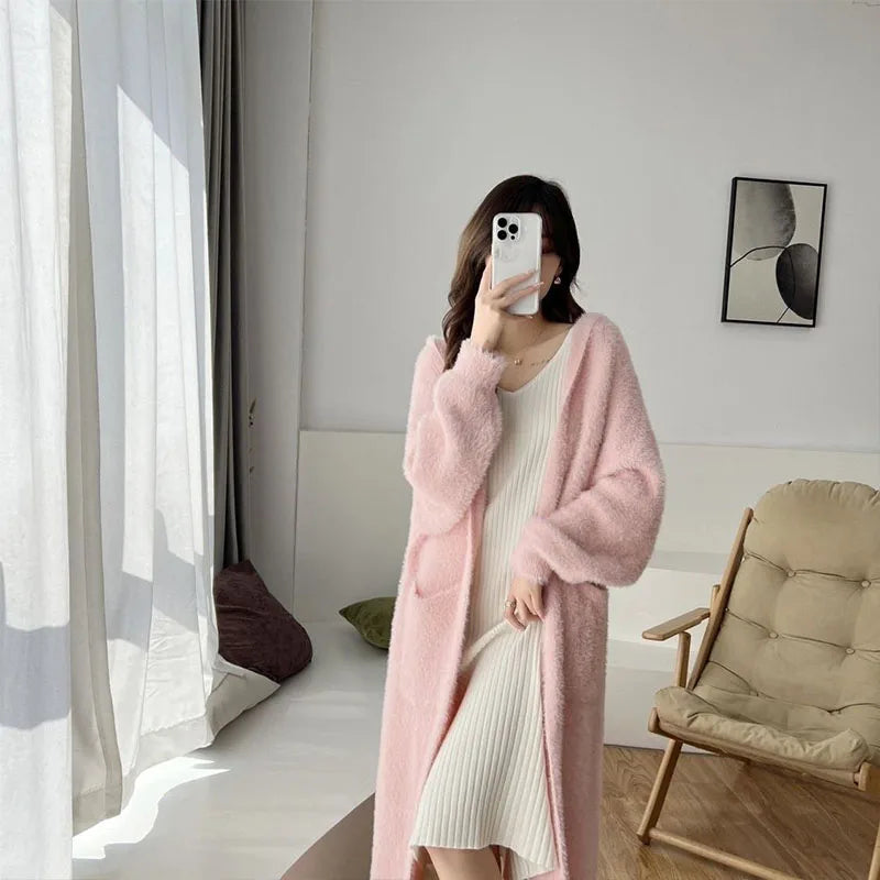 Ein vielseitiger, knielanger Strickmantel mit Kapuze, der Komfort, Alltagstauglichkeit und zeitlose Optik verbindet – ideal für kühle Tage und stilbewusste Trägerinnen.